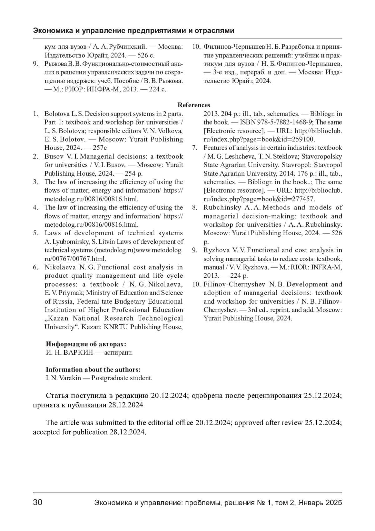 8. Рубчинский А. А. Методы и модели принятия управленческих решений: учебник и практикум для вузов / А. А. Рубчинский. - Москва: 10. Филинов-Ч ернышев Н. Б. Разработка и приня- Издательство Юрайт, 2024. - 526 с.