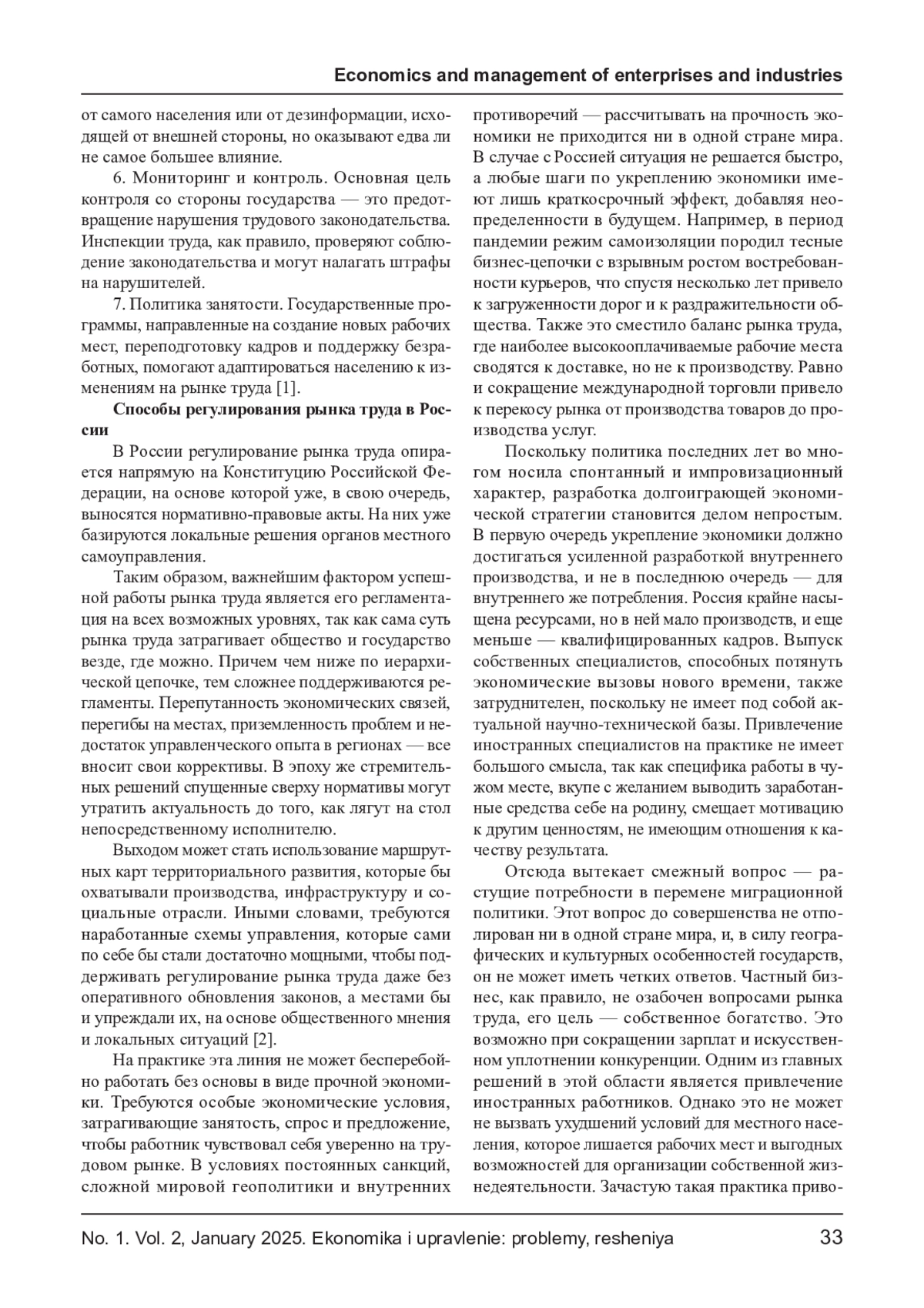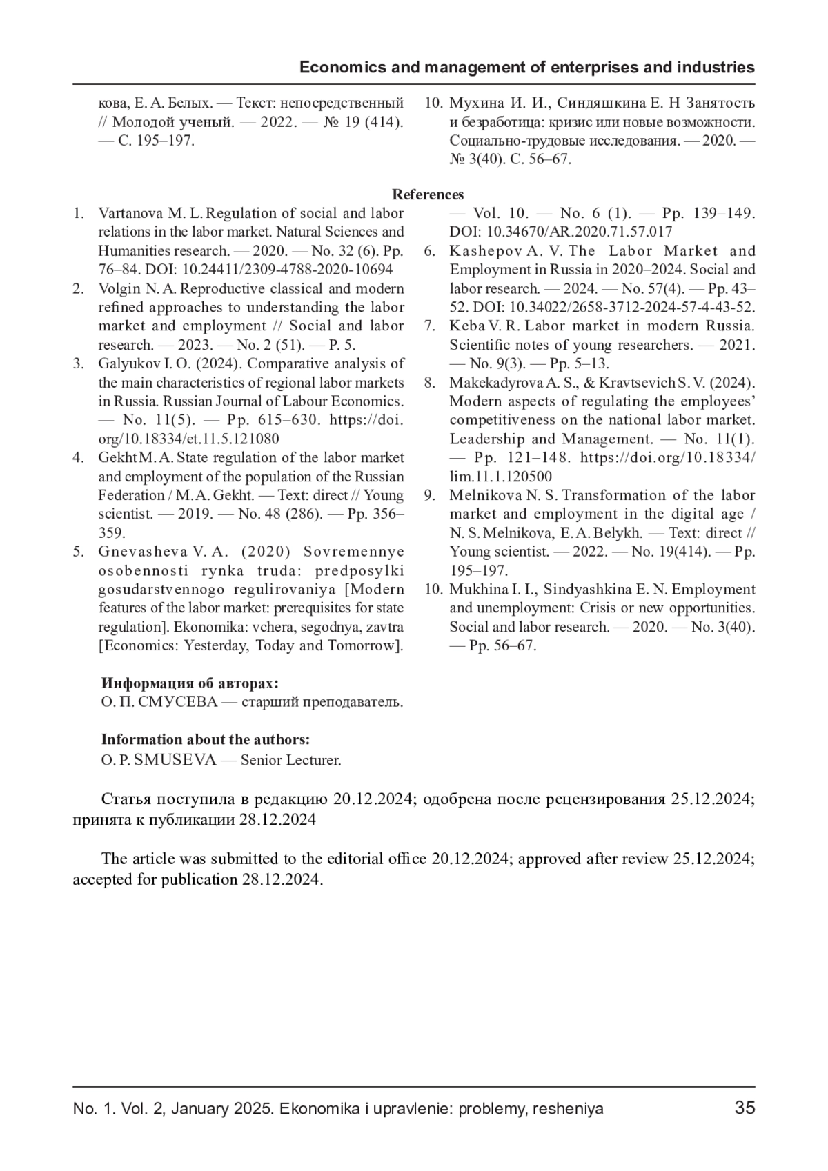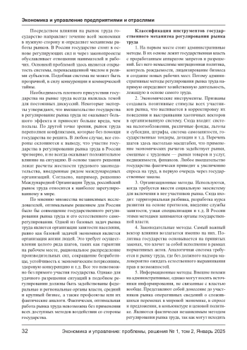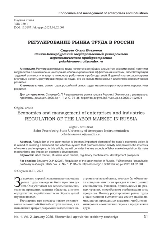СМУСЕВА О. П. РЕГУЛИРОВАНИЕ РЫНКА ТРУДА В РОССИИ // ЭКОНОМИКА И УПРАВЛЕНИЕ: ПРОБЛЕМЫ, РЕШЕНИЯ. 2025. ТОМ 2 № 1
