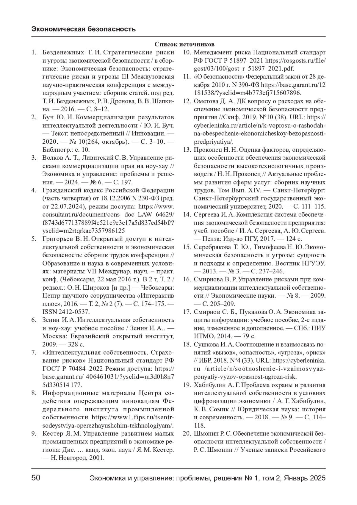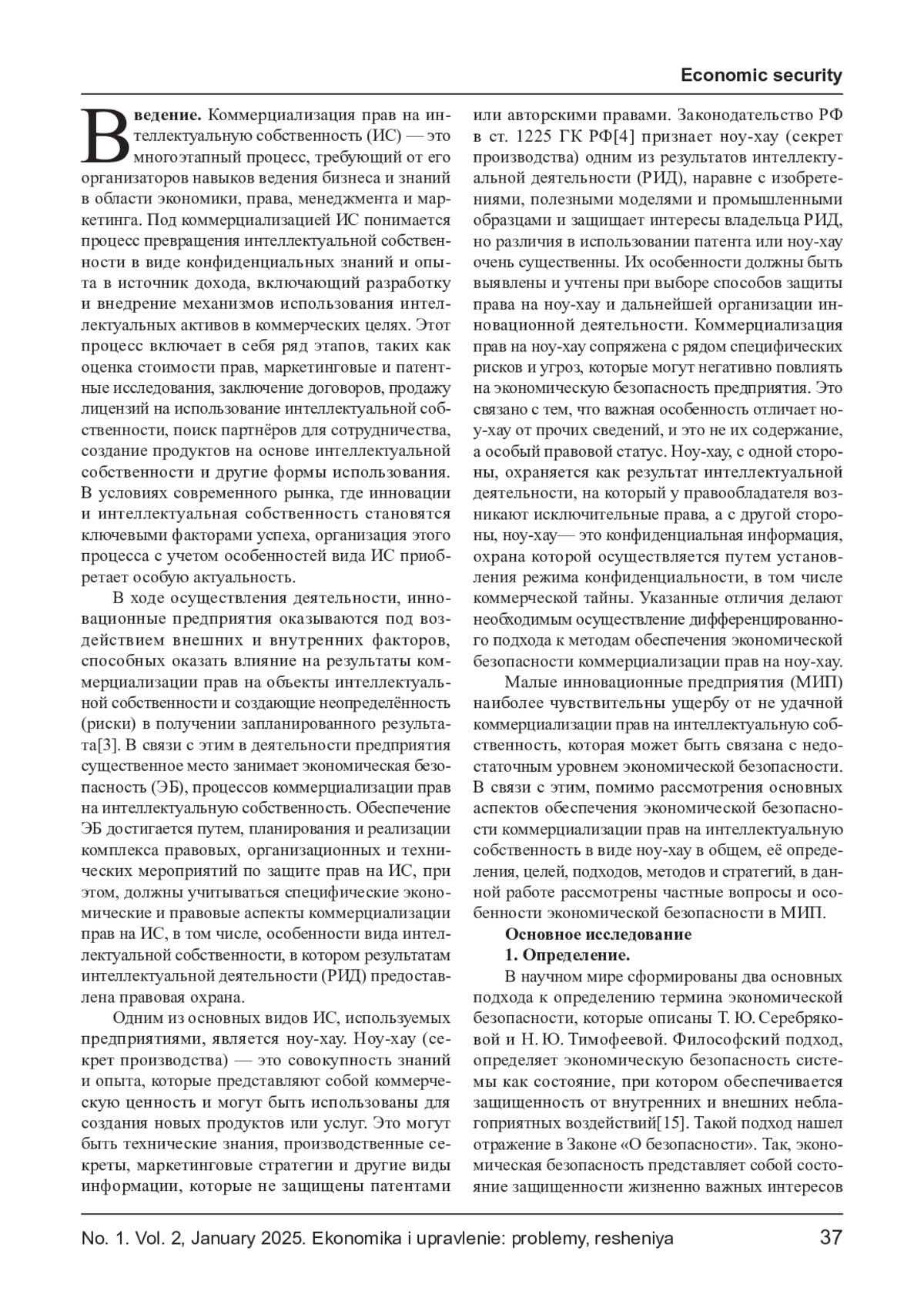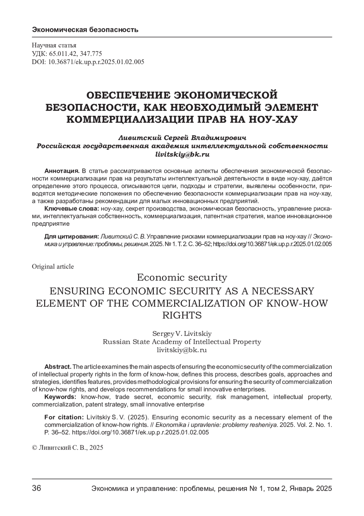 ЛИВИТСКИЙ С. В. ОБЕСПЕЧЕНИЕ ЭКОНОМИЧЕСКОЙ БЕЗОПАСНОСТИ, КАК НЕОБХОДИМЫЙ ЭЛЕМЕНТ КОММЕРЦИАЛИЗАЦИИ ПРАВ НА НОУ-ХАУ // ЭКОНОМИКА И УПРАВЛЕНИЕ: ПРОБЛЕМЫ, РЕШЕНИЯ. 2025. ТОМ 2 № 1