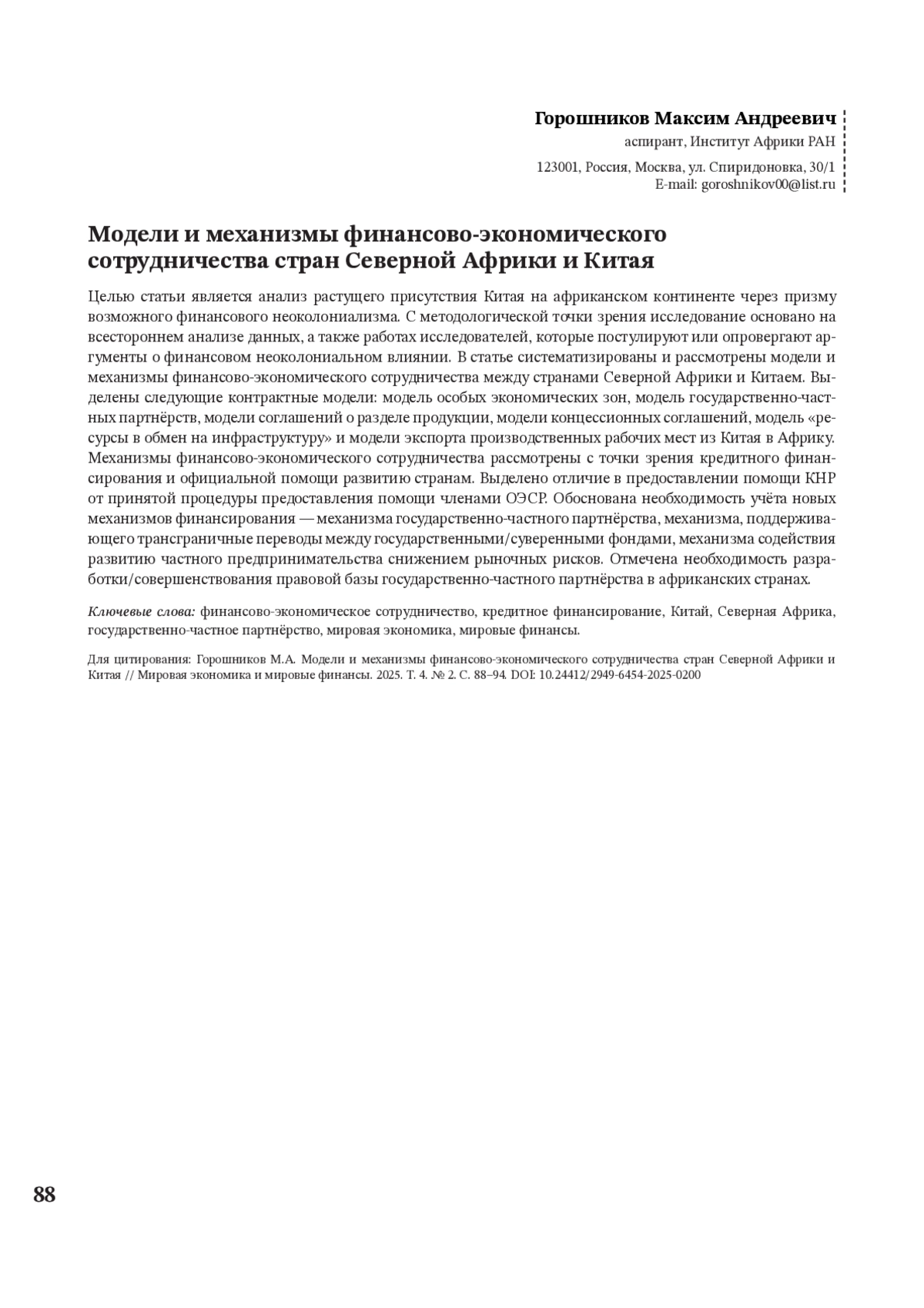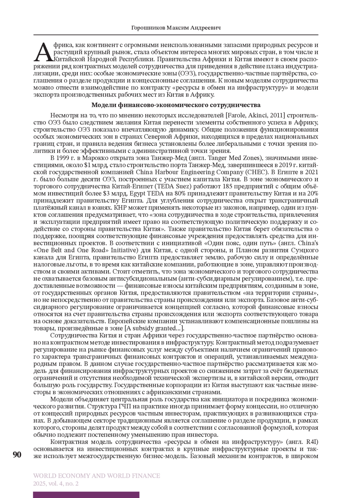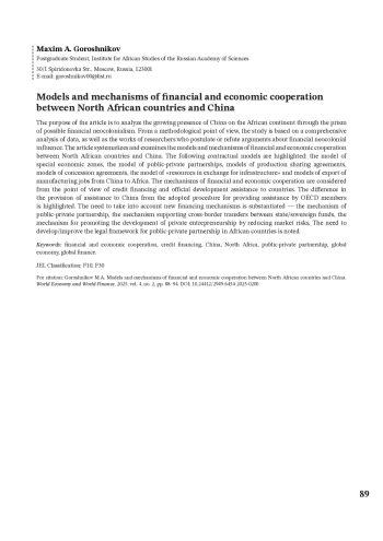 ГОРОШНИКОВ М. А. МОДЕЛИ И МЕХАНИЗМЫ ФИНАНСОВО-ЭКОНОМИЧЕСКОГО СОТРУДНИЧЕСТВА СТРАН СЕВЕРНОЙ АФРИКИ И КИТАЯ // МИРОВАЯ ЭКОНОМИКА И МИРОВЫЕ ФИНАНСЫ. 2025. № 2, ТОМ 4