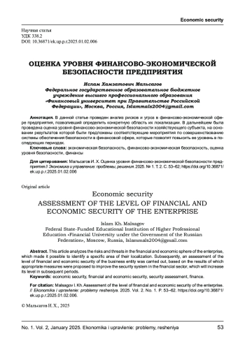 В данной статье проведен анализ рисков и угроз в финансово- экономической сфере предприятия, позволивший определить конкретную область их локализации. В дальнейшем была проведена оценка уровня финансово- экономической безопасности хозяйствующего субъекта, на основании результатов которой были предложены соответствующие мероприятия по совершенствованию системы обеспечения безопасности в финансовой сфере, которые позволят повысить ее уровень в последующих периодах.