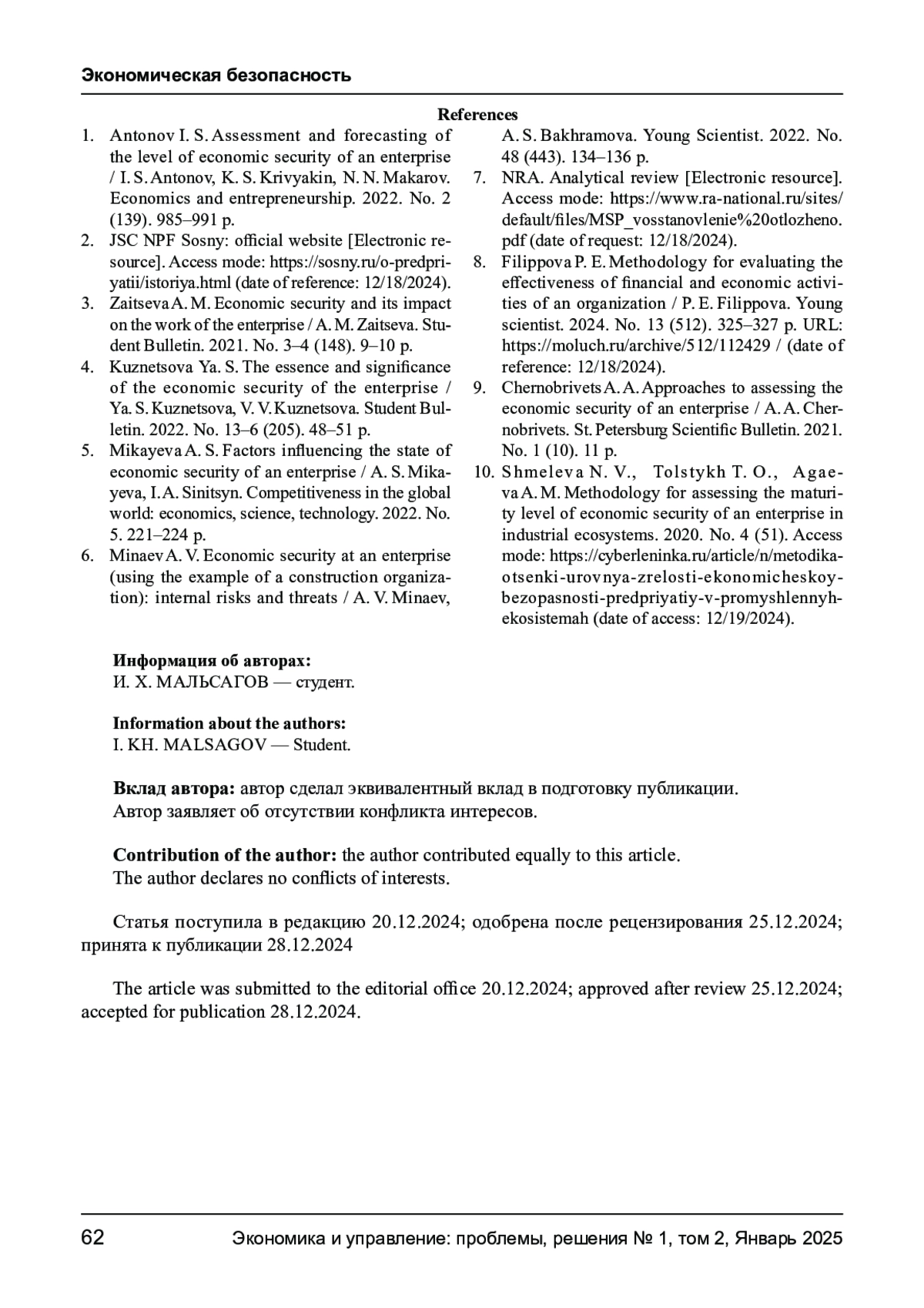 9. Чернобривец А. А. Подходы к оценке экономической безопасности предприятия / А. А. Чернобривец // Санкт-П етербургский научный вестник. 2021. № 1 (10). 11 с.