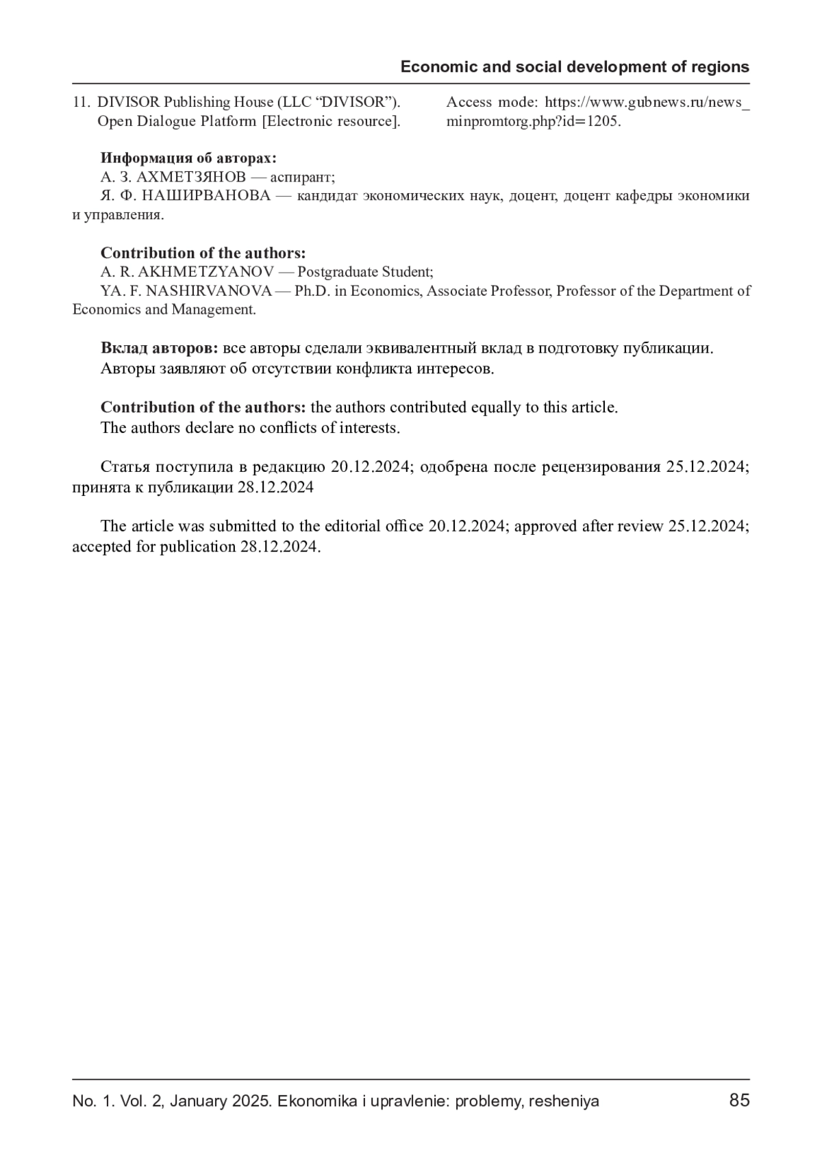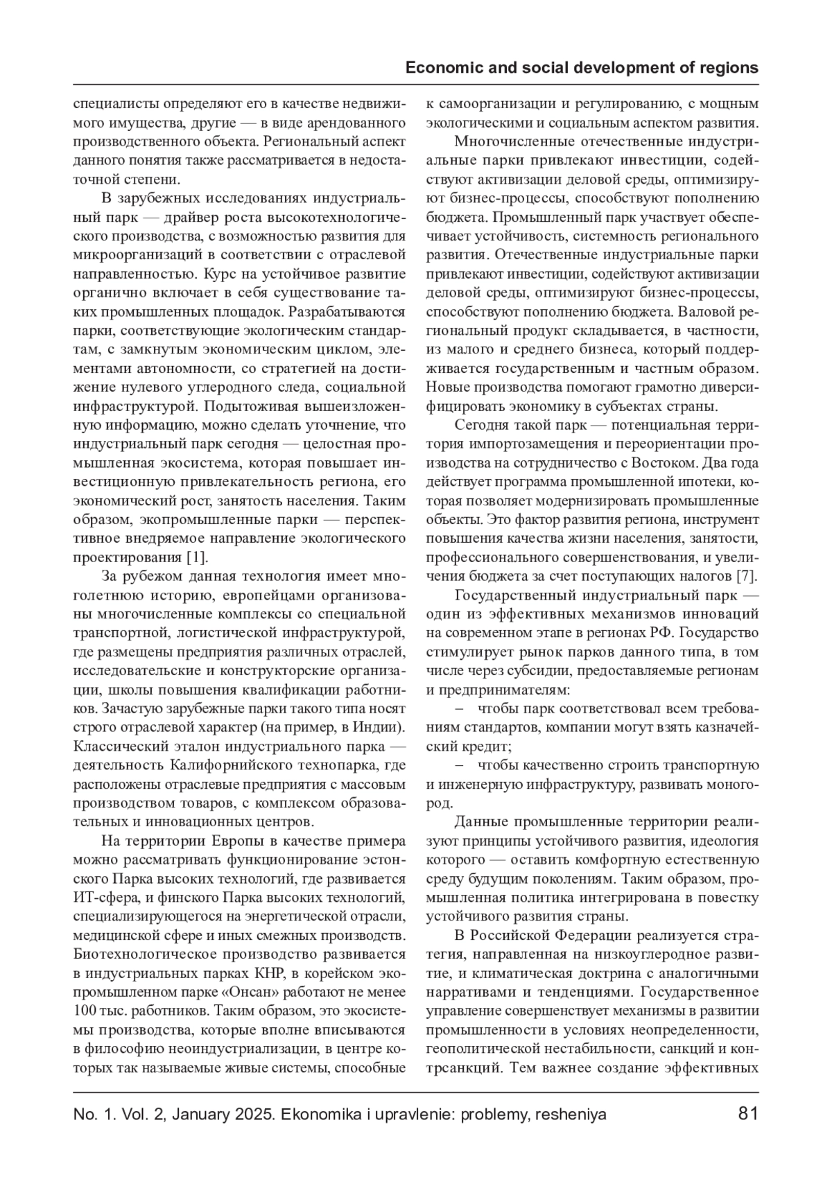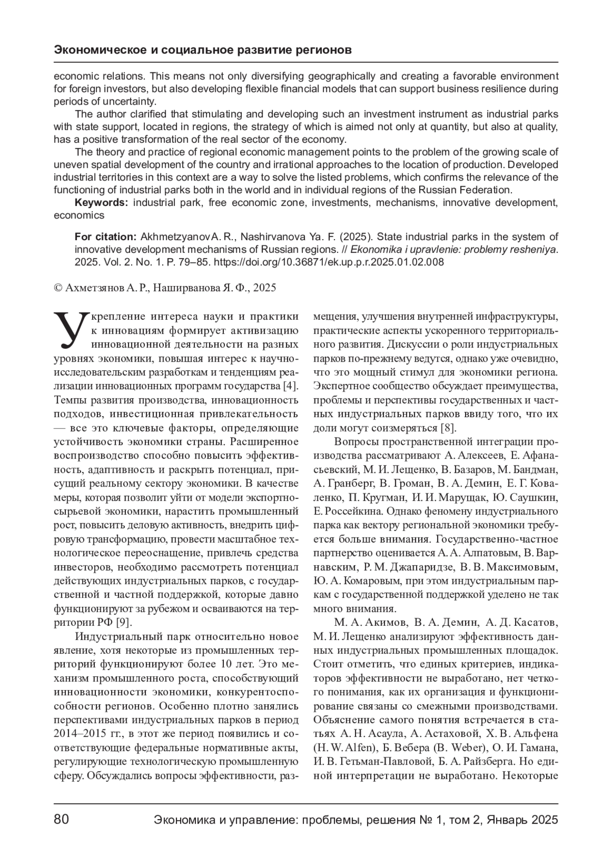 АХМЕТЗЯНОВ А. Р., НАШИРВАНОВА Я. Ф. ГОСУДАРСТВЕННЫЕ ИНДУСТРИАЛЬНЫЕ ПАРКИ В СИСТЕМЕ МЕХАНИЗМОВ ИННОВАЦИОННОГО РАЗВИТИЯ РОССИЙСКИХ РЕГИОНОВ // ЭКОНОМИКА И УПРАВЛЕНИЕ: ПРОБЛЕМЫ, РЕШЕНИЯ. 2025. ТОМ 2 № 1