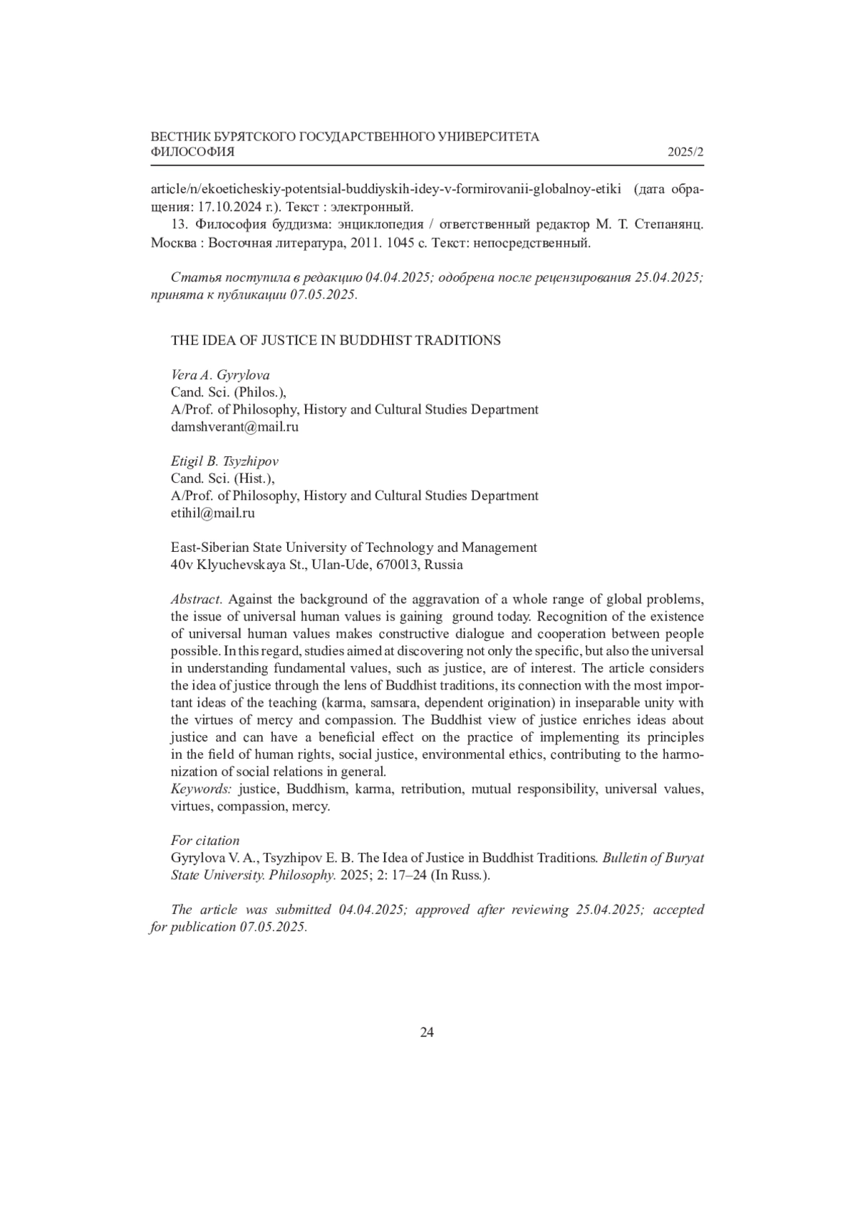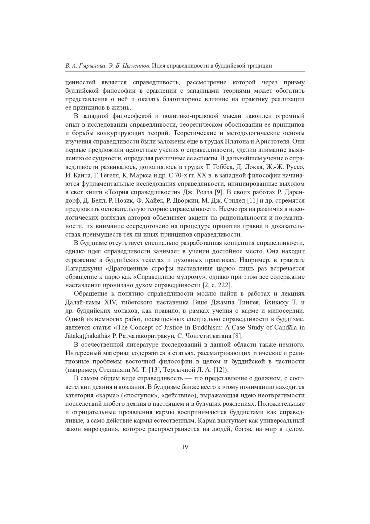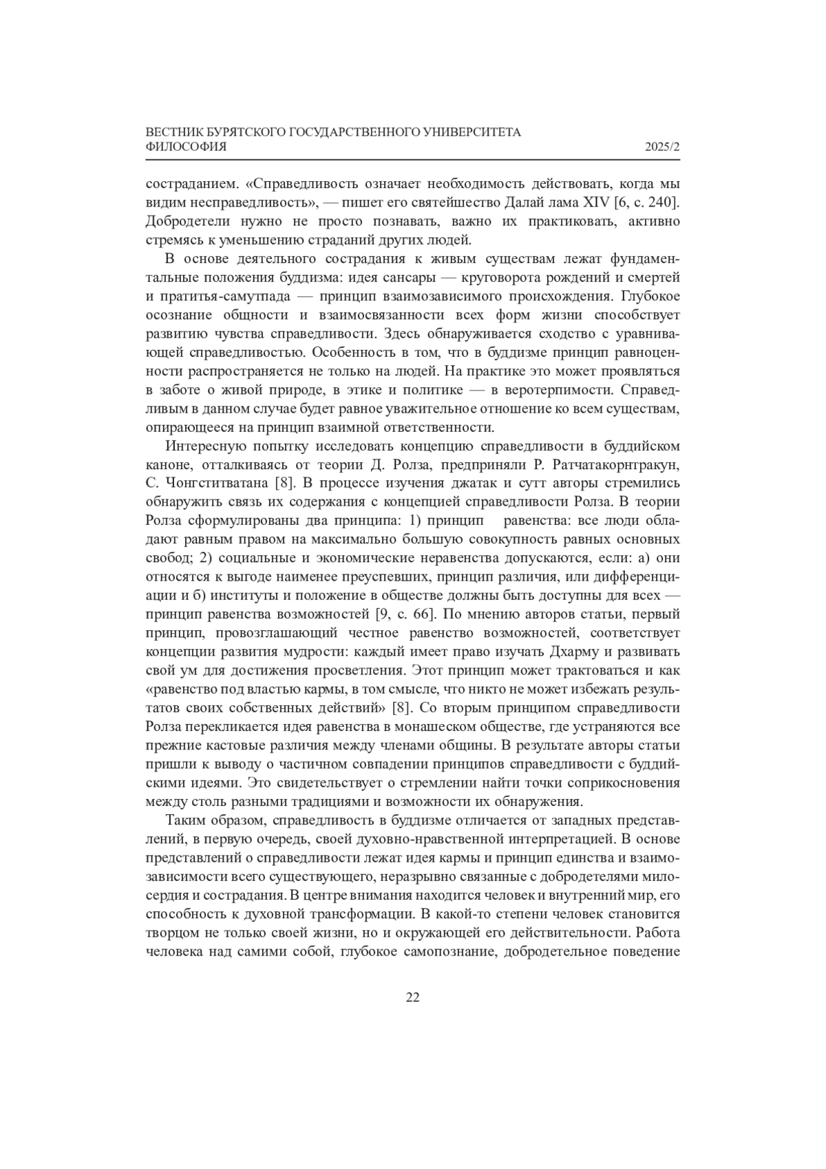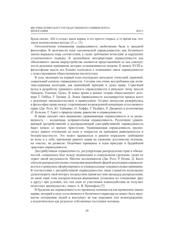 На фоне современных политических, социально-экономических и экологических катаклизмов проблема общечеловеческих ценностей приобретает особую актуальность. Признание существования универсалий делает возможным конст- руктивный диалог и сотрудничество людей. В этом контексте особый интерес представляют исследования, направленные на выявление не только культурно специфичных, но и универсально значимых интерпретаций фундаментальных ценностей в разных культурных традициях. Одной из важнейших духовно-нравственных ценностей является справедливость, рассмотрение которой через призму буддийской философии в сравнении с западными теориями может обогатить представления о ней и оказать благотворное влияние на практику реализации ее принципов в жизнь.