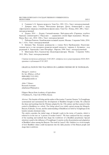 Основоположник тибетского буддизма Гелуг Чже Цонкапа в своем фундаментальном трактате «Ламрим Ченмо» систематизировал и подвел итоги развития буддийской мысли в Индии. Он собрал те идеи и учения, которые тибетцы переняли к XV в. и представляли центральными для буддизма в целом. Школа Гелуг получила широкое распространение среди монголов, бурят, калмыков, тувинцев, и то понимание буддизма, изложенное Цонкапой в Ламрим, сегодня остается доминирующим. Целью статьи является рассмотрение начального этапа развития личности в контексте Ламрим, именуемой в трактате «низшей личностью». Рассматриваются ключевые понятия учения и методы, формирующие мировоззренческие основы буддийского практика. Особое внимание уделено влиянию Ламрим Цонкапы на распространение и адаптацию буддийских ценностей среди бурят. Сочинение ламы Э.-Х. Галшиева является ярким примером того, как буддийские ценности инкорпорируются в ежедневную практику бурят и определяют их мировоззренческие основы.