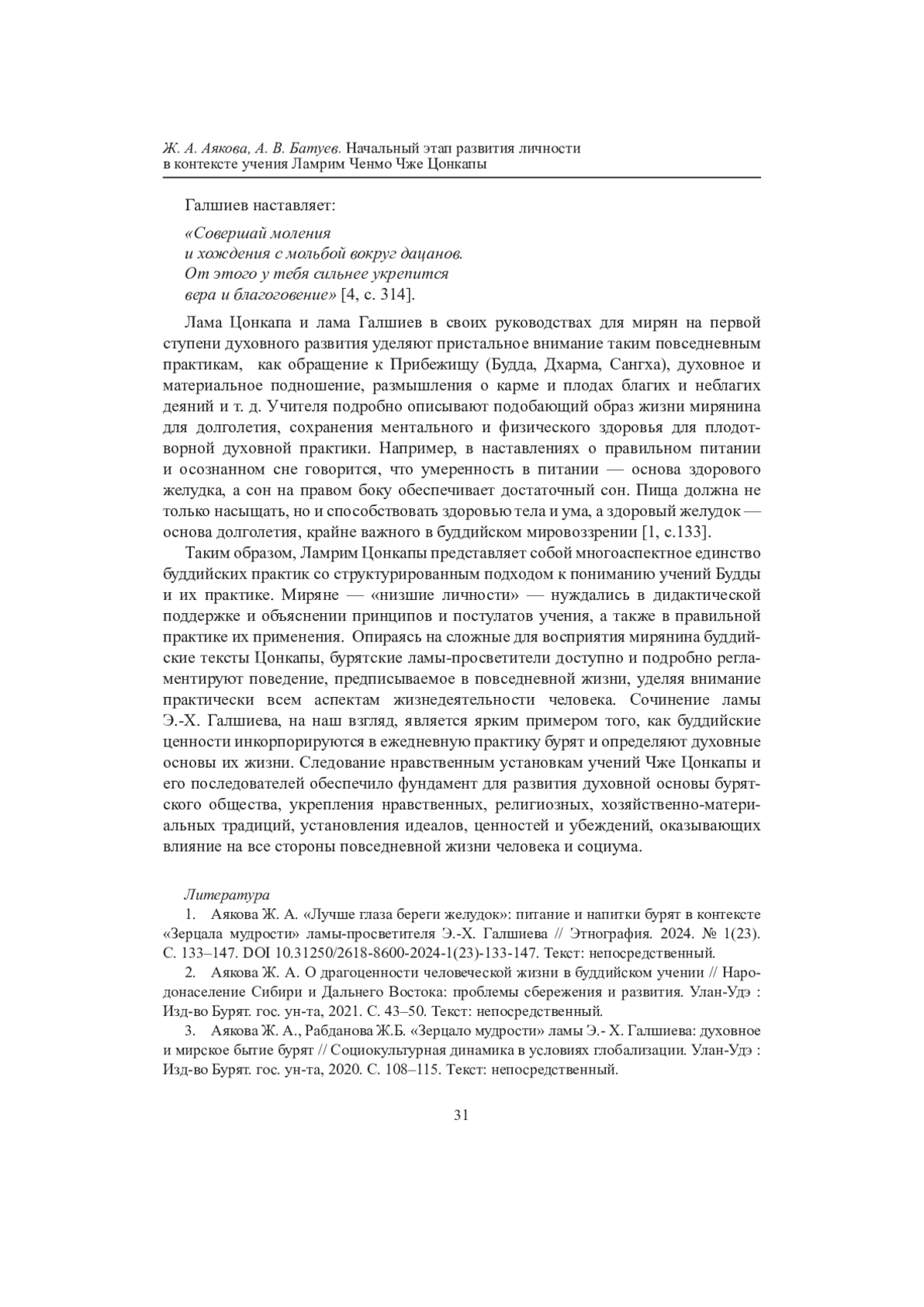 1. Аякова Ж. А. “Лучше глаза береги желудок”: питание и напитки бурят в контексте “Зерцала мудрости” ламы-просветителя Э.-Х. Галшиева // Этнография. 2024. № 1(23). С. 133-147. Текст: непосредственный. DOI: 10.31250/2618-8600-2024-1(23)-133-147 EDN: EALTHY