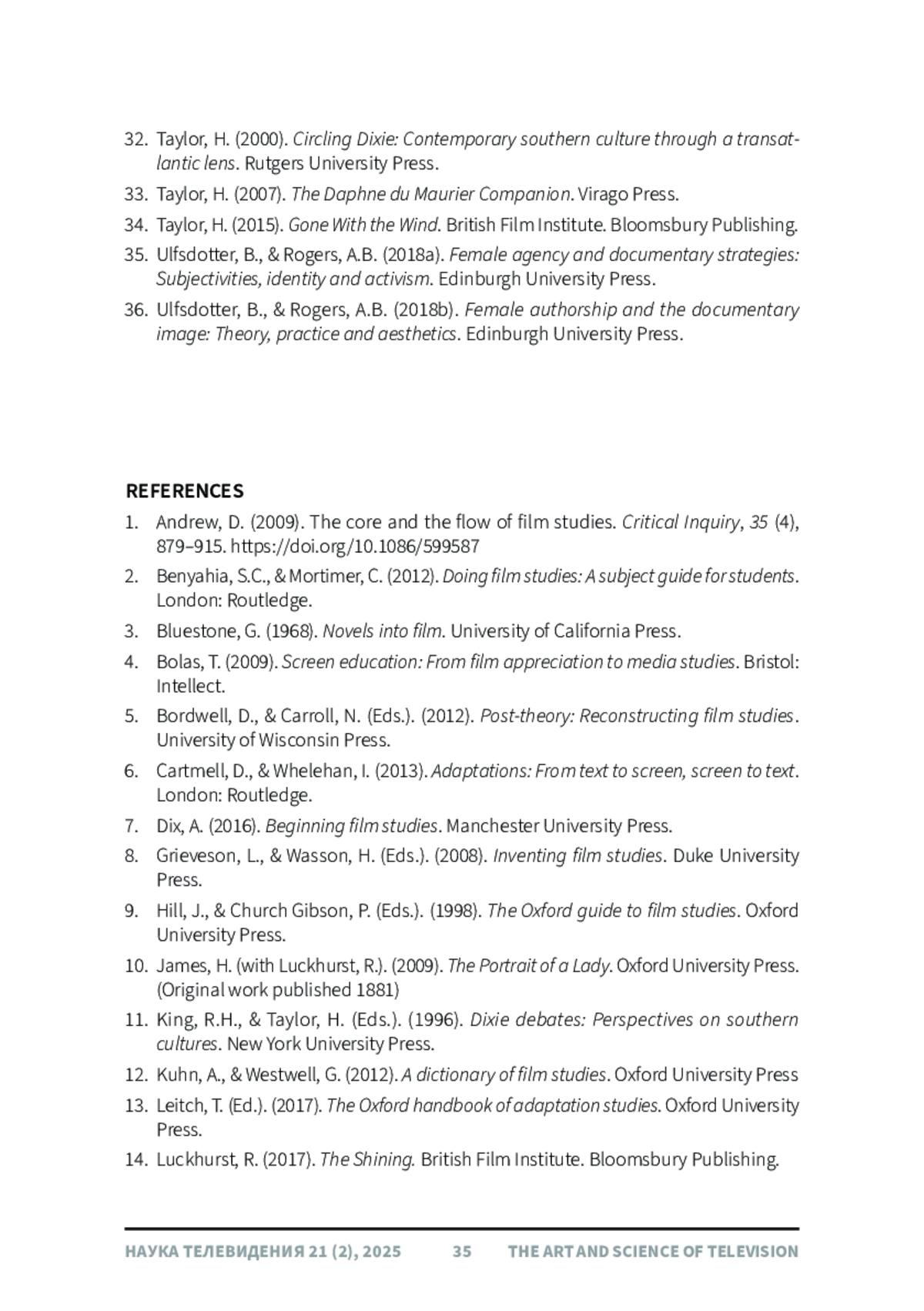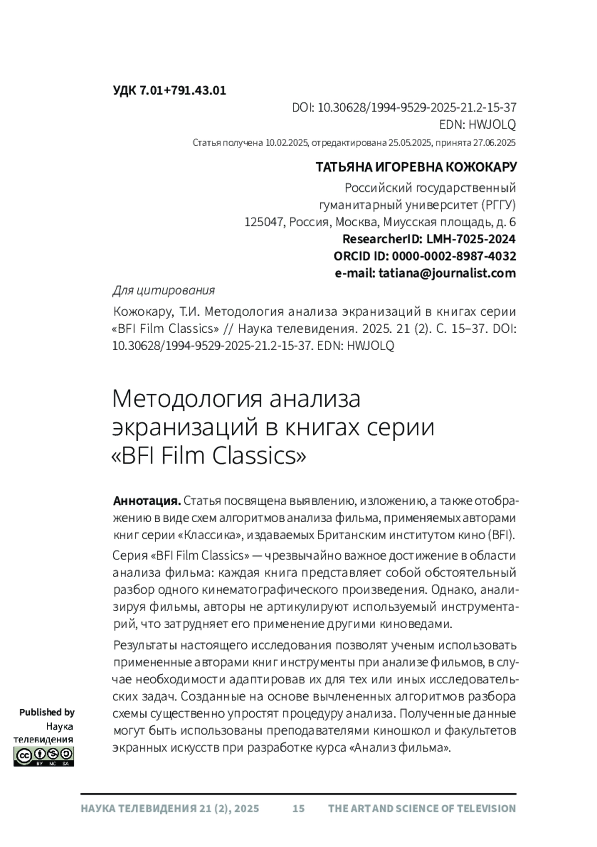 Статья посвящена выявлению, изложению, а также отображению в виде схем алгоритмов анализа фильма, применяемых авторами книг серии «Классика», издаваемых Британским институтом кино (BFI). Серия «BFI Film Classics» - чрезвычайно важное достижение в области анализа фильма: каждая книга представляет собой обстоятельный разбор одного кинематографического произведения. Однако, анализируя фильмы, авторы не артикулируют используемый инструментарий, что затрудняет его применение другими киноведами. Результаты настоящего исследования позволят ученым использовать примененные авторами книг инструменты при анализе фильмов, в случае необходимости адаптировав их для тех или иных исследовательских задач. Созданные на основе вычлененных алгоритмов разбора схемы существенно упростят процедуру анализа. Полученные данные могут быть использованы преподавателями киношкол и факультетов экранных искусств при разработке курса «Анализ фильма». В силу ограниченности объема в данной статье подробно рассматриваются три исследования - тексты, посвященные фильмам «Пикник у Висячей скалы» (Picnic at Hanging Rock, 1975), «Сияние» (The Shining, 1980) и «Унесенные ветром» (Gone With the Wind, 1939).