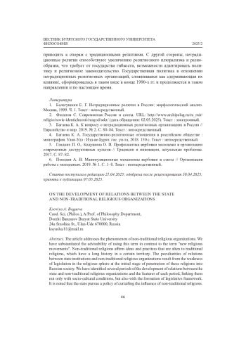 3. Багаева К. А. К вопросу о нетрадиционных религиозных организациях в России // Евразийство и мир. 2019. № 2. С. 80-84. Текст: непосредственный. EDN: JOERGY