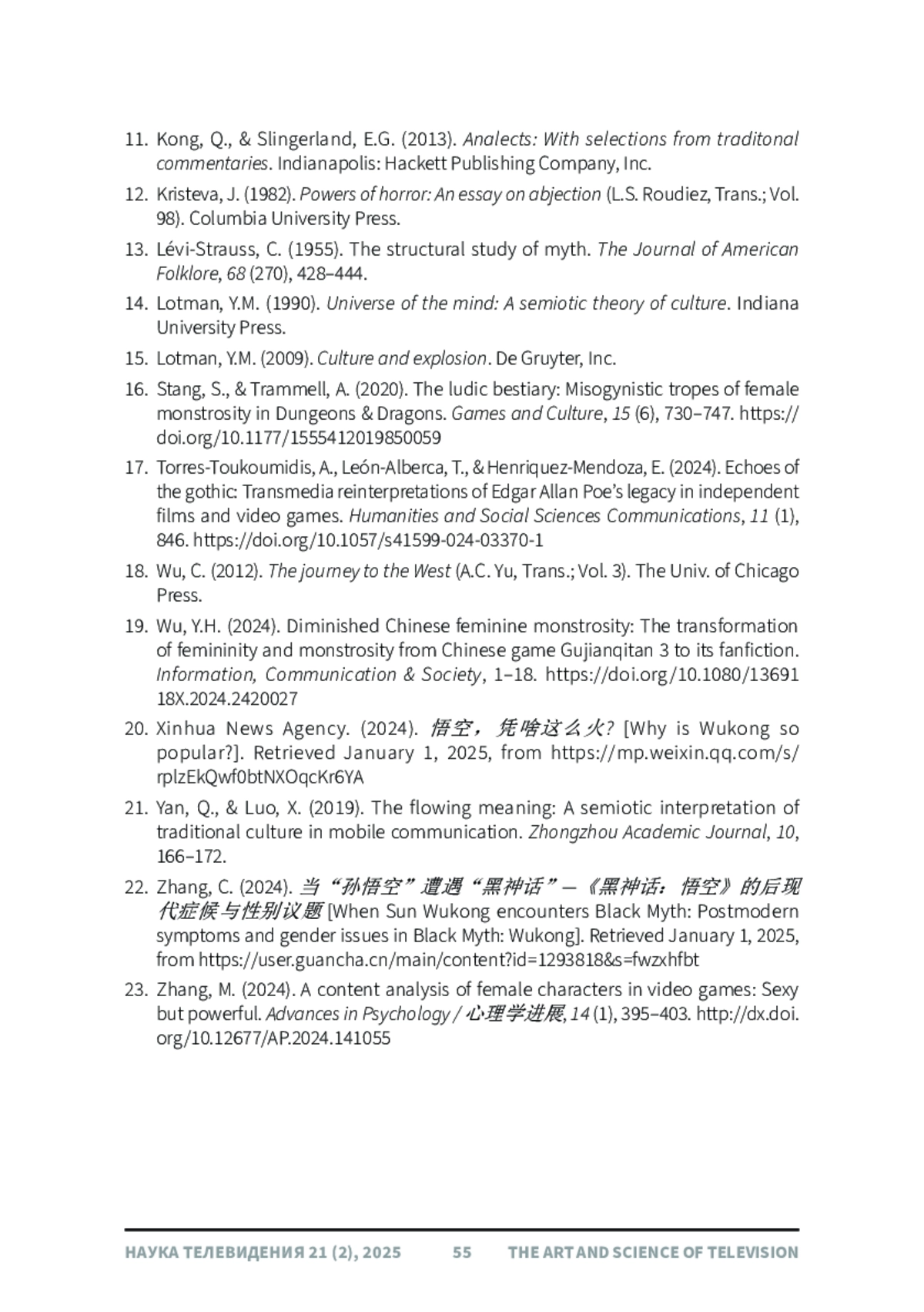 В данной статье рассматривается переосмысление образа демона-паука как традиционного китайского гендерного символа, начиная с романа «Путешествие на Запад» (У Чэнъэнь, 1592) и заканчивая современной видеоигрой «Черный миф: Укун» (2024). Используя культурную семиотику и теорию чудовищно-женственного, авторы сравнивают материалы романа и игры посредством текстового анализа и анализа тональности 1000 наиболее популярных комментариев к связанным видеороликам Bilibili. Анализ тональности показывает преимущественно положительный прием (69%), хотя критика гендерной репрезентации сохраняется. Результаты показывают, что благодаря нарративной реконструкции в игре демоны-пауки превращаются из одномерных соблазнительниц в многомерные фигуры с более человечным внешним видом. Их образы не только отражают глубокие эмоции, моральные дилеммы и самосознание, но и включают в себя эстетику, вдохновленную династией Тан, для усиления их культурного контекста, сохраняя при этом определенные чудовищные черты и ощущение трагической судьбы. Более того, в статье подчеркивается, что вместо того, чтобы отказываться от традиционных архетипов, игра переосмысливает их с эмоциональной глубиной и символической преемственностью, иллюстрируя, как культурные символы могут быть адаптированы для отражения более широких изменений в гендерном дискурсе и сложности повествования.