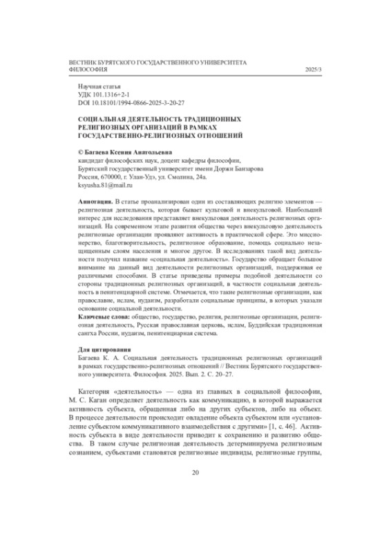 В статье проанализирован один из составляющих религию элементов - религиозная деятельность, которая бывает культовой и внекультовой. Наибольший интерес для исследования представляет внекультовая деятельность религиозных организаций. На современном этапе развития общества через внекультовую деятельность религиозные организации проявляют активность в практической сфере. Это миссионерство, благотворительность, религиозное образование, помощь социально незащищенным слоям населения и многое другое. В исследованиях такой вид деятельности получил название «социальная деятельность». Государство обращает большое внимание на данный вид деятельности религиозных организаций, поддерживая ее различными способами. В статье приведены примеры подобной деятельности со стороны традиционных религиозных организаций, в частности социальная деятельность в пенитенциарной системе. Отмечается, что такие религиозные организации, как православие, ислам, иудаизм, разработали социальные принципы, в которых указали основание социальной деятельности.