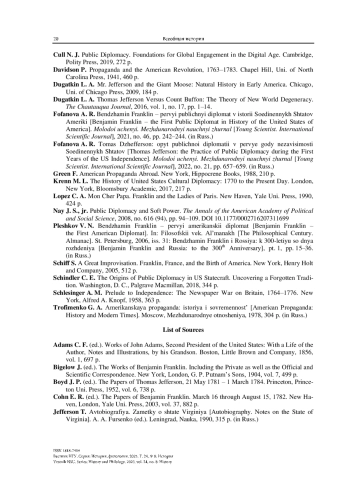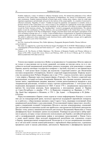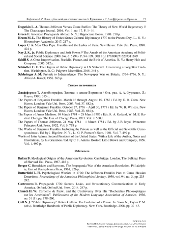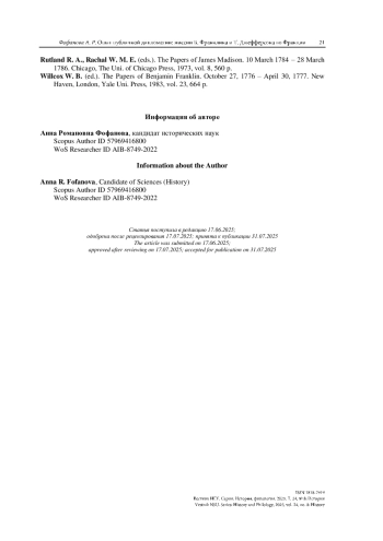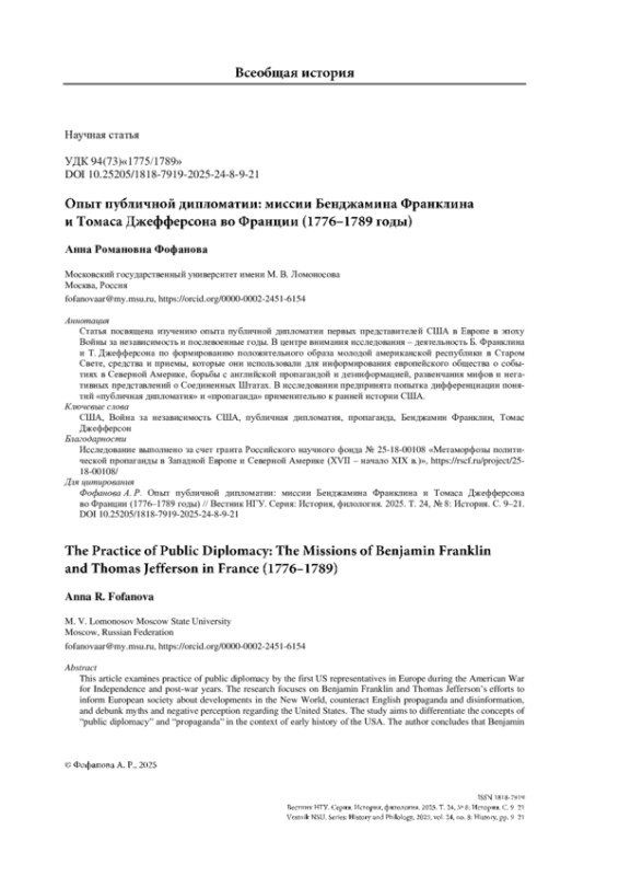 ФОФАНОВА А. Р. ОПЫТ ПУБЛИЧНОЙ ДИПЛОМАТИИ: МИССИИ БЕНДЖАМИНА ФРАНКЛИНА И ТОМАСА ДЖЕФФЕРСОНА ВО ФРАНЦИИ (1776–1789 ГОДЫ) // ВЕСТНИК НГУ. СЕРИЯ: ИСТОРИЯ, ФИЛОЛОГИЯ. 2025. ТОМ 24, № 8