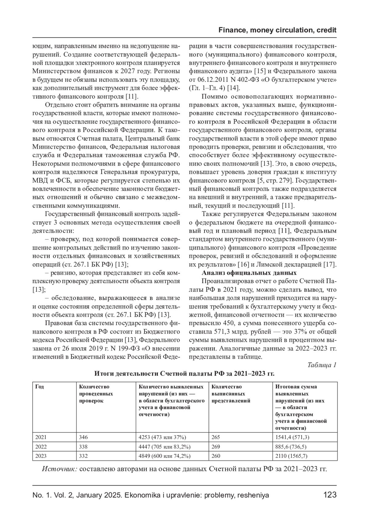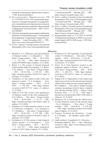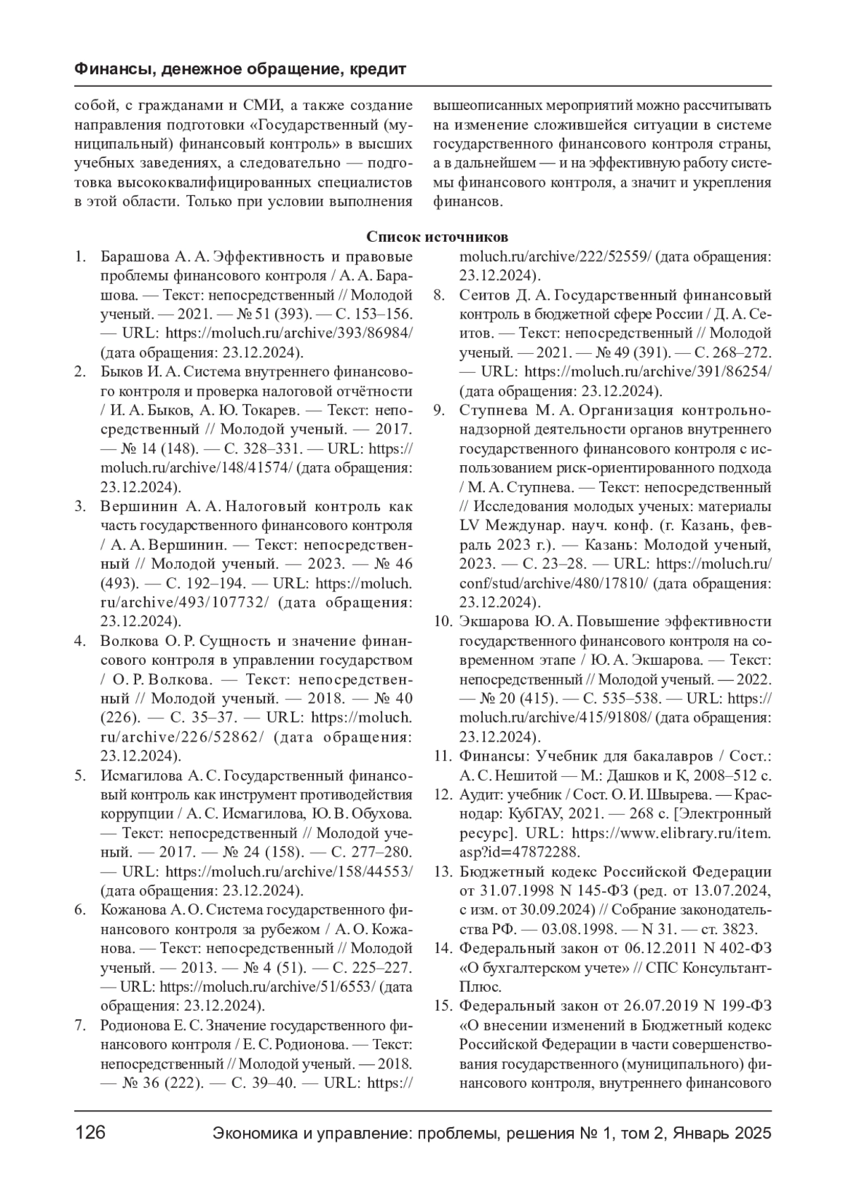 1. Барашова А. А. Эффективность и правовые проблемы финансового контроля / А. А. Барашова. - Текст: непосредственный // Молодой ученый. - 2021. - № 51 (393). - С. 153-156. - URL: https://moluch.ru/archive/393/86984/(дата обращения: 23.12.2024). EDN: TMBOEN