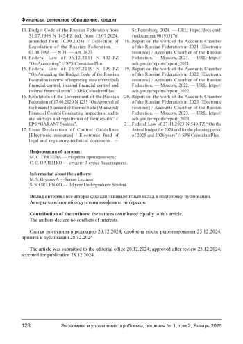 7. Родионова Е. С. Значение государственного финансового контроля / Е. С. Родионова. - Текст: непосредственный // Молодой ученый. - 2018. - № 36 (222). - С. 39-40. - URL: https://moluch.ru/archive/222/52559/(дата обращения: 23.12.2024). EDN: XZATKX