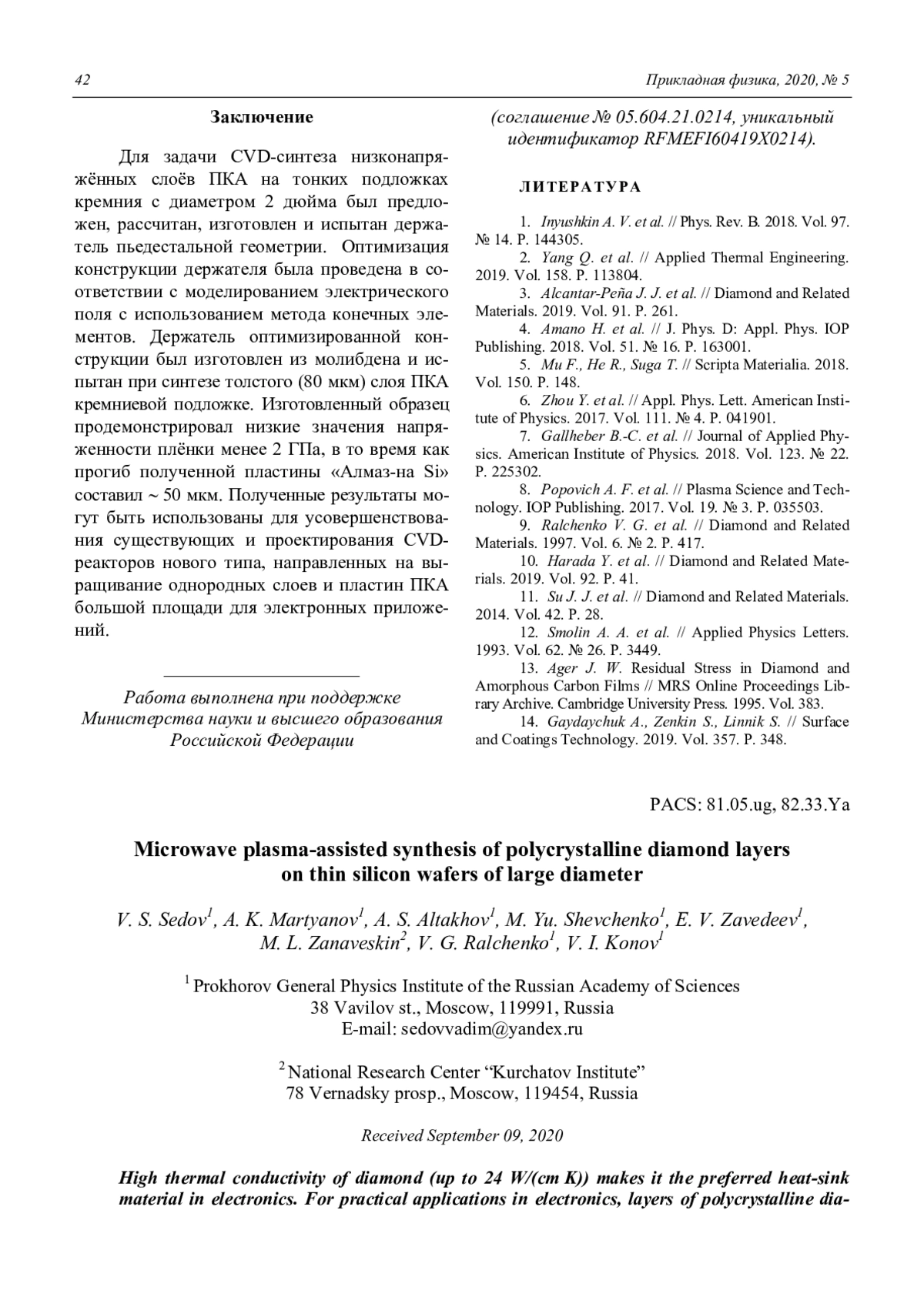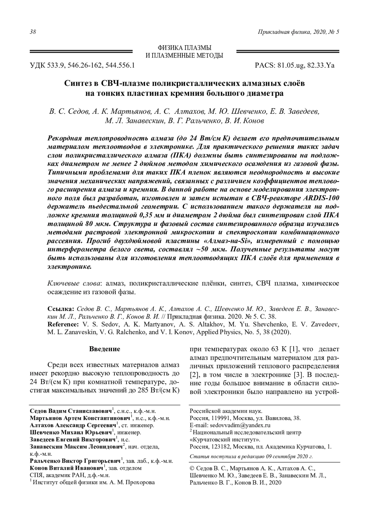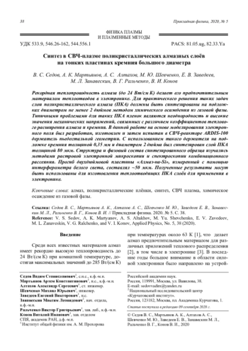 СЕДОВ В. С., МАРТЬЯНОВ А. К., АЛТАХОВ А. С., ШЕВЧЕНКО М. Ю., ЗАВЕДЕЕВ Е. В., ЗАНАВЕСКИН М. Л., РАЛЬЧЕНКО В. Г., КОНОВ В. И. СИНТЕЗ В СВЧ-ПЛАЗМЕ ПОЛИКРИСТАЛЛИЧЕСКИХ АЛМАЗНЫХ СЛОЁВ НА ТОНКИХ ПЛАСТИНАХ КРЕМНИЯ БОЛЬШОГО ДИАМЕТРА // ПРИКЛАДНАЯ ФИЗИКА. 2020. № 5