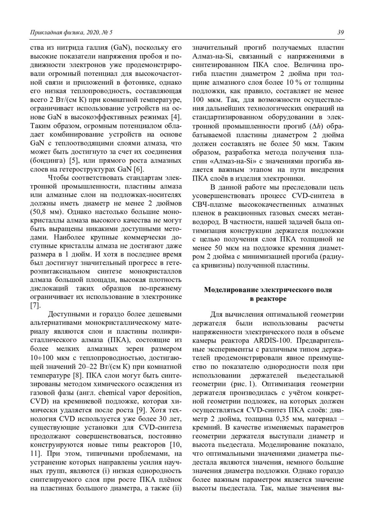 Рекордная теплопроводность алмаза (до 24 Вт/см К) делает его предпочтительным материалом теплоотводов в электронике. Для практического решения таких задач слои поликристаллического алмаза (ПКА) должны быть синтезированы на подложках диаметром не менее 2 дюймов методом химического осаждения из газовой фазы. Типичными проблемами для таких ПКА пленок являются неоднородность и высокие значения механических напряжений, связанных с различием коэффициентов теплового расширения алмаза и кремния. В данной работе на основе моделирования электронного поля был разработан, изготовлен и затем испытан в СВЧ-реакторе ARDIS-100 держатель пьедестальной геометрии. С использованием такого держателя на подложке кремния толщиной 0,35 мм и диаметром 2 дюйма был синтезирован слой ПКА толщиной 80 мкм. Структура и фазовый состав синтезированного образца изучались методами растровой электронной микроскопии и спектроскопии комбинационного рассеяния. Прогиб двухдюймовой пластины «Алмаз-на-Si», измеренный с помощью интерферометра белого света, составлял ~50 мкм. Полученные результаты могут быть использованы для изготовления теплоотводящих ПКА слоёв для применения в электронике.