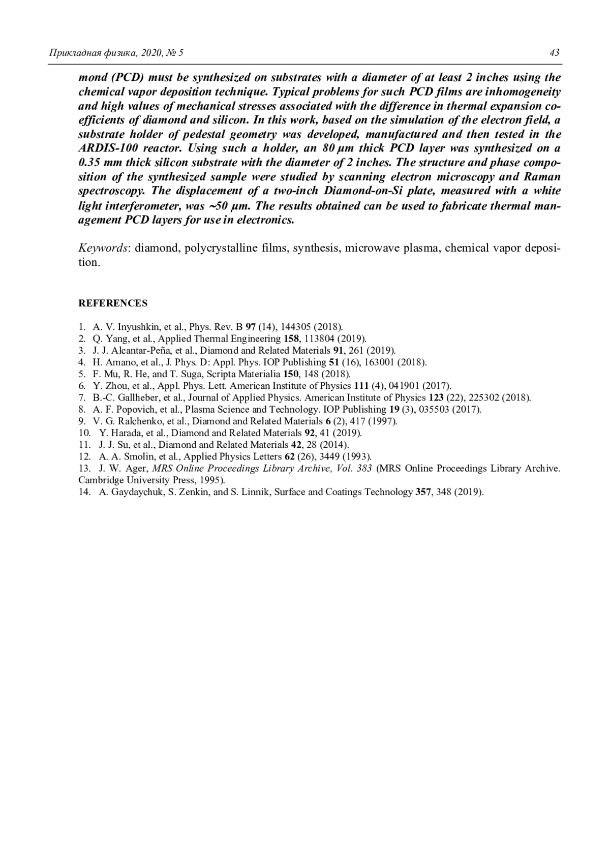 Статья: Синтез в СВЧ-плазме поликристаллических алмазных слоёв на тонких пластинах кремния большого диаметра (2020)