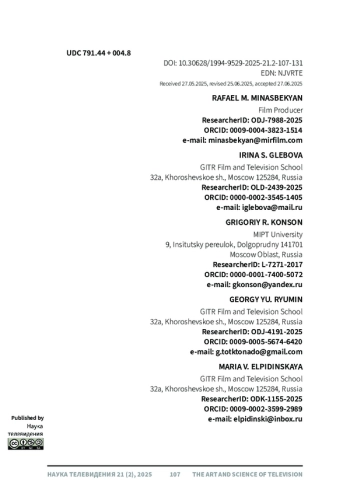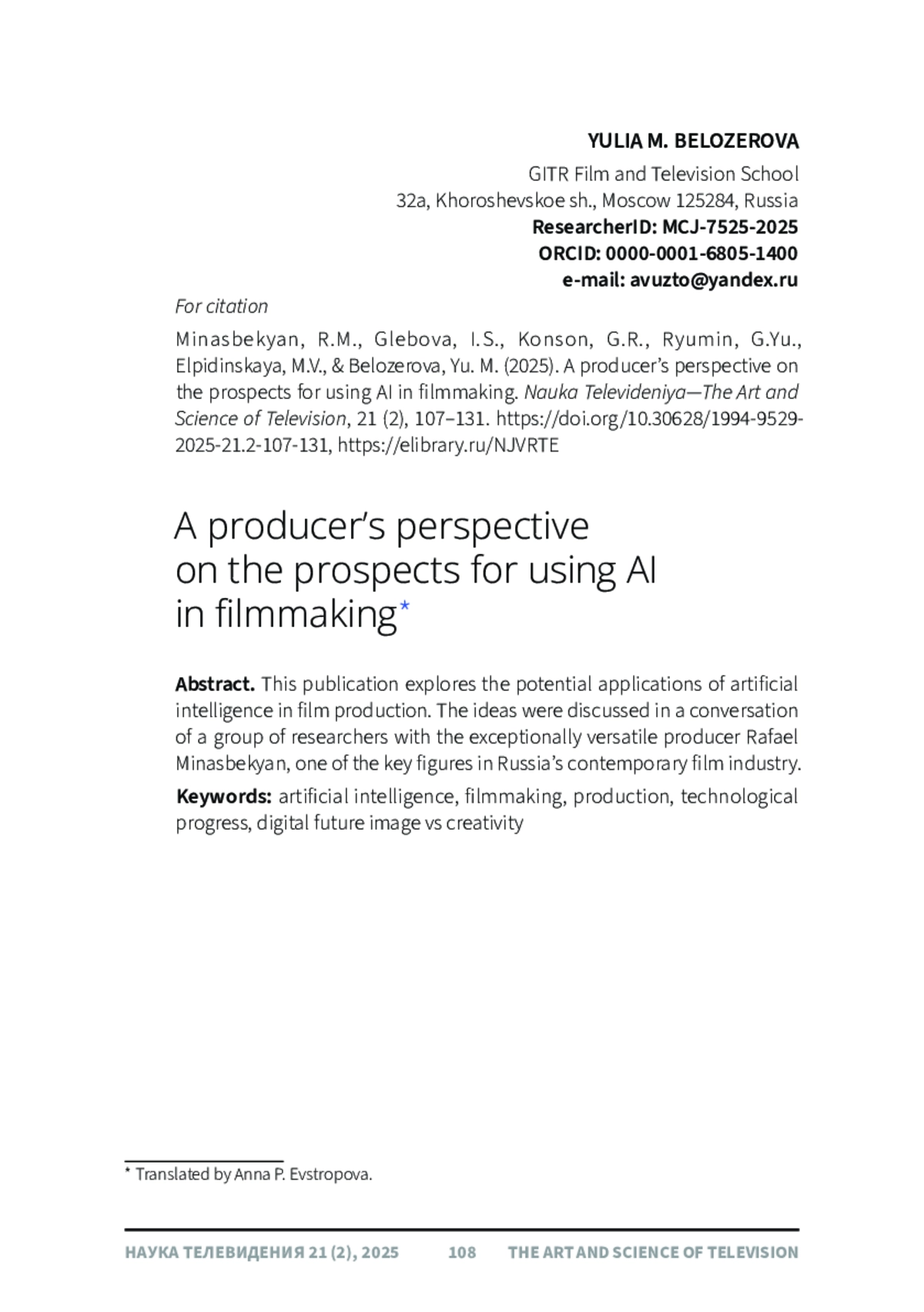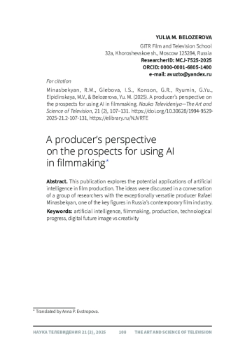 В представленной публикации предпринята попытка изучить возможности применения технологий искусственного интеллекта в кинопроизводстве, что раскрывается в идеях, обсуждаемых группой исследователей с выдающимся разносторонним продюсером Рафаелом Минасбекяном, являющимся одним из ключевых акторов современного кинопроизводства России.