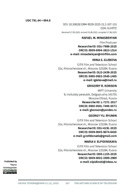 The authors interviewed Rafael Minasbekyan—a producer, screenwriter, director, and executive leader of several organizations pivotal to Russia’s media landscape. Previously a CEO of GPM KIT (Gazprom-Media’s Cinema. Internet. Television Group), a subsidiary of Gazprom Media, the largest media holding in Russia and Eastern Europe, he now heads the film company Mirfilm.1 This interview explores film production through the lens of artificial intelligence versus artistic creativity, examining its societal mission while considering consumer rights and freedoms.