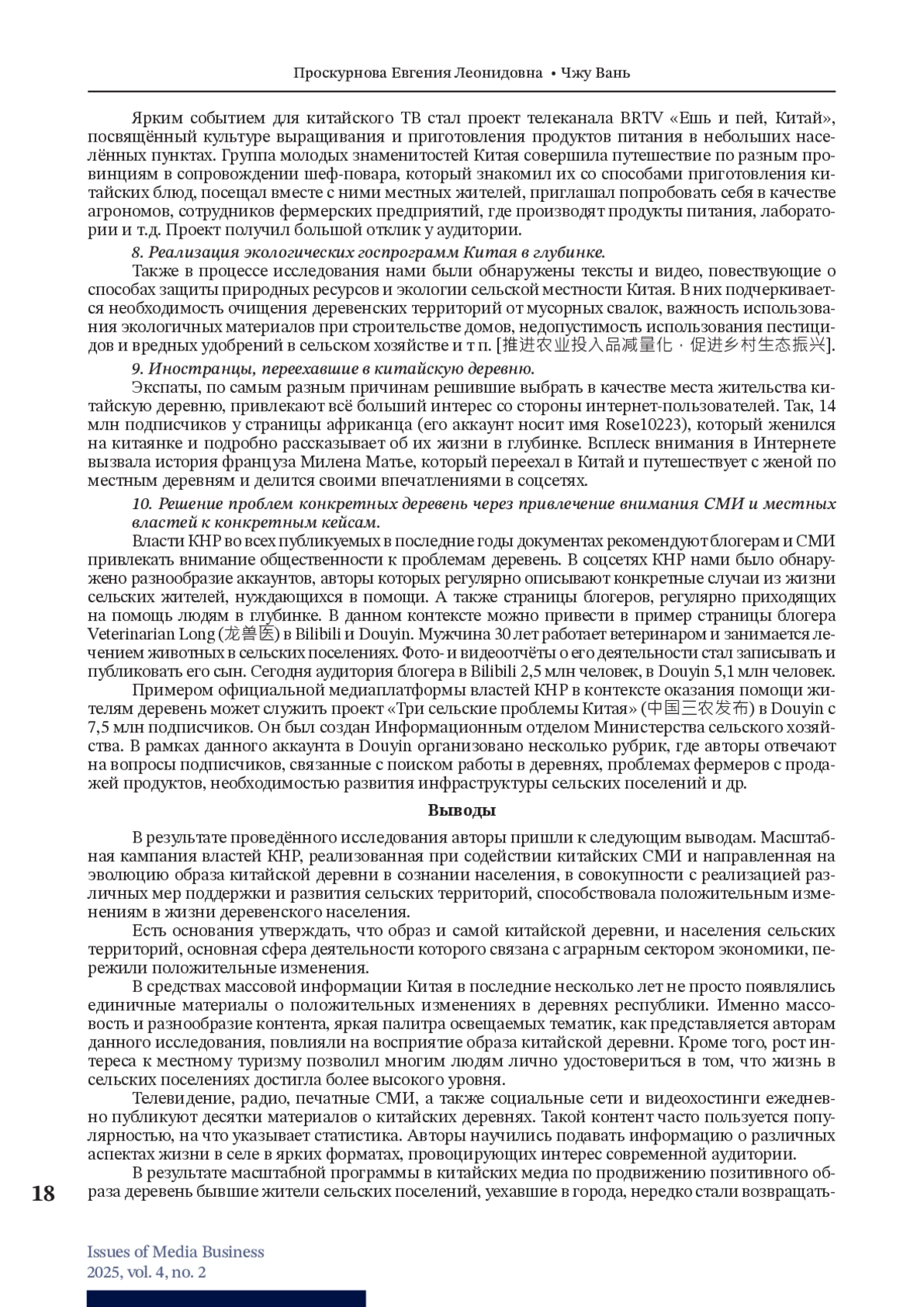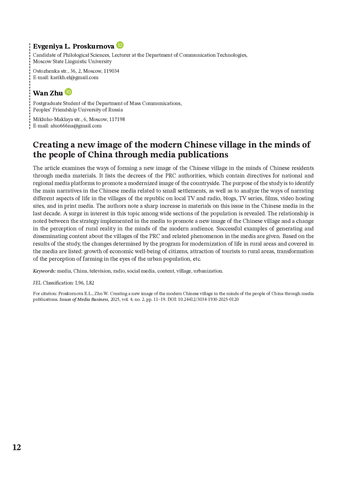ПРОСКУРНОВА Е. Л., ЧЖУ В. ФОРМИРОВАНИЕ НОВОГО ОБРАЗА СОВРЕМЕННОЙ КИТАЙСКОЙ ДЕРЕВНИ В СОЗНАНИИ НАСЕЛЕНИЯ КНР ЧЕРЕЗ МАТЕРИАЛЫ В СМИ // ВОПРОСЫ МЕДИАБИЗНЕСА. 2025. № 2, ТОМ 4