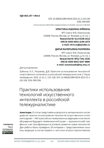 В статье изложены результаты эмпирических исследований практики использования технологий искусственного интеллекта (далее - ИИ) в российских телевизионных редакциях в двадцатых дискуссиях будущей телевизионной (шире - журналистской) профессии и ее трансформации в условиях развития новых технологий. Для работы было проведено 18 интервью с направлениями, входящими в состав первого и частично второго мультиплексов, т. е. е. обязательных общедоступных телеканалов телевидения. Результаты исследования показывают, что сотрудники телевизионных редакций в силе профессиональных специалистов решают с помощью ИИ ряд достаточно тривиальных задач, что позволяет оптимизировать работу редакции и ускорить процесс редактирования. Одной из важных проблем применения технологии ИИ являются вопросы этики и авторского права, которые решаются в каждой редакции по-своему. Многие информанты основаны на создании внутриредакционных стандартов работы с технологиями ИИ и закреплении правил работы с новыми технологиями на законодательном уровне. По мере вероятной трансформации телевизионных участников исследования отдельных направлений оптимизации и ускорения некоторых «механических» процессов, благодаря чему журналисты концентрируются на создании более качественного и эксклюзивного контента. Среди возможных негативных последствий развития технологий ИИ в работе редактирования: увеличение скорости рабочих процессов, что может сказаться на повышении уровня стресса журналистов; увеличение количества фейковых новостей, сгенерированных ИИ; здоровая творческая профессия.