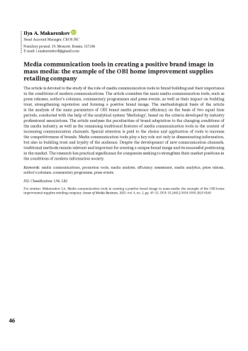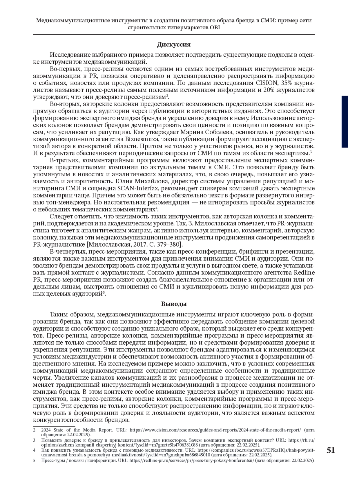 В условиях современного информационного общества медиакоммуникации занимают центральное место в процессе формирования общественного мнения и восприятия брендов. С учетом стремительного развития цифровых технологий и увеличения числа информационных каналов, компании сталкиваются с необходимостью оптимального использования медиакоммуникационных инструментов для создания и поддержания положительного имиджа. Проведенное исследование демонстрирует, что медиакоммуникационные инструменты — это не просто способ распространения информации, но эффективный механизм формирования доверия, лояльности и репутации бренда. На примере OBI продемонстрировано, как можно трансформировать негативный информационный фон и нарастить позитивное присутствие бренда в медиапространстве. Исследование демонстрирует конкретный механизм управления репутацией через медиакоммуникации, который будет актуален для современных брендов, которые хотят сформировать собственный позитивный имидж.