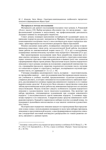 Статья выполнена в русле идей лингвистики текста и посвящена определению роли структурно-композиционных характеристик портретного описания в формировании образа героя в романе, написанном художником. В качестве материала для анализа выбран текст романа А. Романовой «Холст, масло». В статье в качестве примера приводится анализ портретного описания одной героини романа - Анны Вадим (глава 4). Новизна подхода определяется обращением к искусствоведческой литературе и описанием прототипической модели живописного портрета, которая служит основой для структурно-композиционного анализа портретного описания. Целью работы было выявление специфики использования структурно-композиционных средств при создании образа героя в особом типе портретного описания. Были получены следующие результаты. Показано, что автор-художник при создании портретного описания ориентируется на прототипическую модель живописного портрета, создающую «портретный текстовый континуум» каждой главы и служащую основой для структурно-композиционного решения романа. В такого рода текстах портретное описание становится текстообразующим функционально-смысловым типом речи и служит средством формирования образа героя.