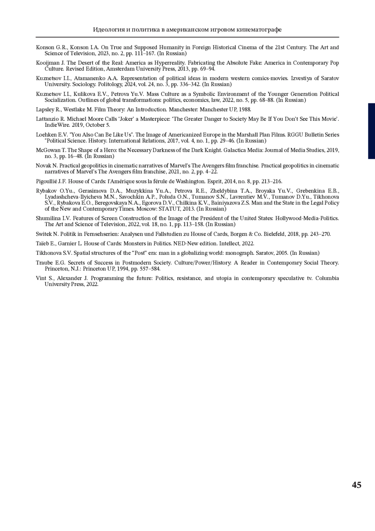 8. Кузнецов И.И. Атаманенко А.А. Репрезентация политических идей в современных западных кинокомиксах // Известия Саратовского университета. Новая серия. Серия: Социология. Политология. 2024. № 3. С. 336-342.
