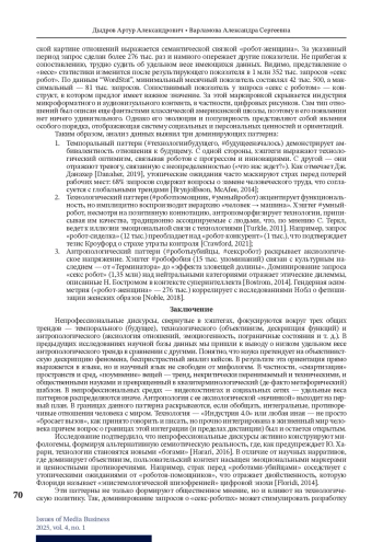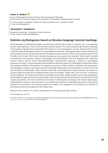 ДЫДРОВ А. А., ВАРЛАМОВА А. С. МИФОЛОГЕМЫ РОБОТОТЕХНИКИ НА МАТЕРИАЛЕ ХЭШТЕГОВ РУССКОЯЗЫЧНОГО ИНТЕРНЕТА // ВОПРОСЫ МЕДИАБИЗНЕСА. 2025. № 1, ТОМ 4