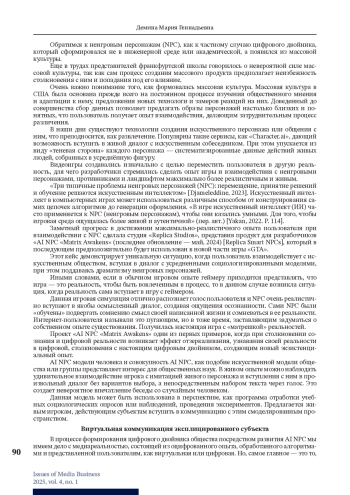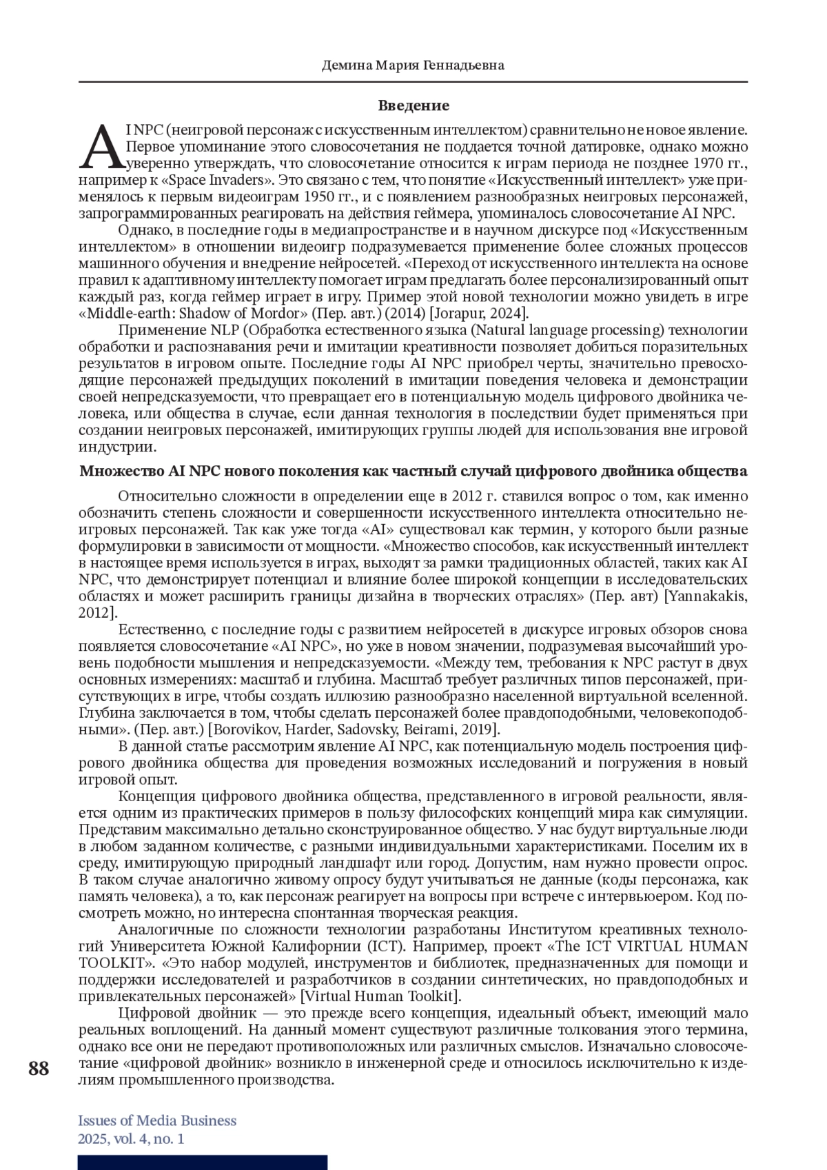 Автор рассматривает феномен AI NPC (неигровой персонаж с искусственным интеллектом) в социально-философском аспекте, как потенциальную модель для построения цифрового двойника общества. Общество в статье рассматривается в реалиях посткоммуникации. Цифровизация, порождающая новую цифровую реальность, строится на замкнутом цикле коммуникации, согласно представлениям о постнеклассической рациональности или о «наблюдении второго порядка» по Никласу Луману. Общество трансформируется за счет цикла коммуникации — от исследования пользователей через метаданные до формирования моделей идеальных цифровых объектов, благодаря внедрению искусственного интеллекта нового поколения. Философская проблема состоит в том, что цифровыми моделями становятся сложные холистические объекты: человек и общество, что одновременно затрагивает проблему целостного идеального объекта. Возникает риск нового экзистенциального кризиса, когда при столкновении сознания и цифровой реальности происходит феномен отзеркаливания, потери возможности для субъекта различать степень ценности цифрового двойника и реального субъекта в межличностной коммуникации. Неигровой персонаж с искусственным интеллектом также рассматривается автором, как продукт стремительного развития рынка видеоигр. Массовая культура всегда была катализатором различных исследований, например, потребительского поведения и исследования общественных процессов. Видеоигры благодаря усиленной системе сбора метаданных становятся более совершенным миром массовой культуры, способным быстро подстраиваться под любое поведение человека, предоставляя вариативный виртуальный опыт. Как пример отдельно рассматривается кейс компании Replica Studios Inc., представившей виртуальный мир неигровых персонажей с искусственным интеллектом с применением технологии распознавания голоса и интерпретации речи. Данная симуляция совершила прорыв в индустрии видеоигр в части опыта взаимодействия с неигровыми персонажами. Автор отмечает положительные аспекты данного феномена. Неигровые персонажи с искусственным интеллектом способны демонстрировать на практике реализацию модели мира, как симуляции, и в перспективе могут быть повсеместно использованы в общественных исследованиях: социологических, маркетинговых.