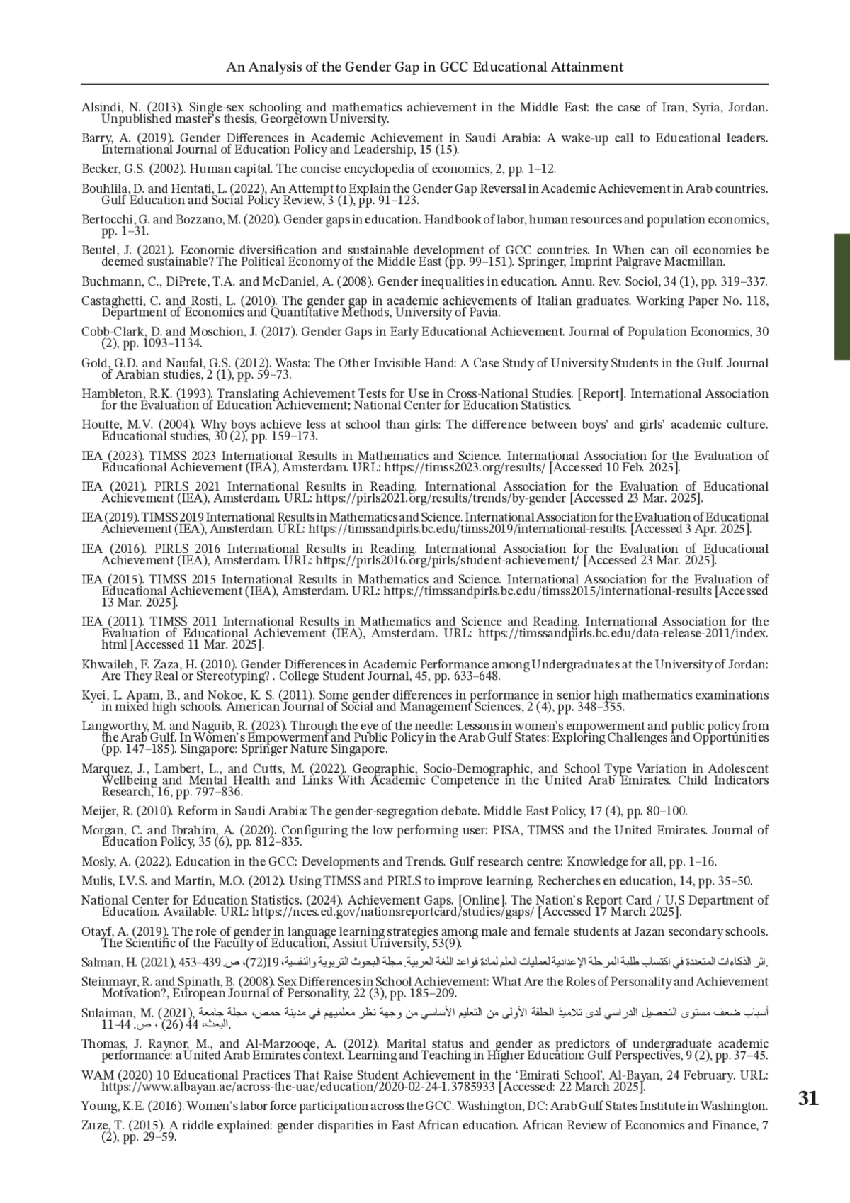 13. Булила Д. и Хентати Л. (2022), Попытка объяснить сокращение гендерного разрыва в успеваемости в арабских странах. Обзор образовательной и социальной политики стран Персидского залива, 3 (1), стр. 91-123.