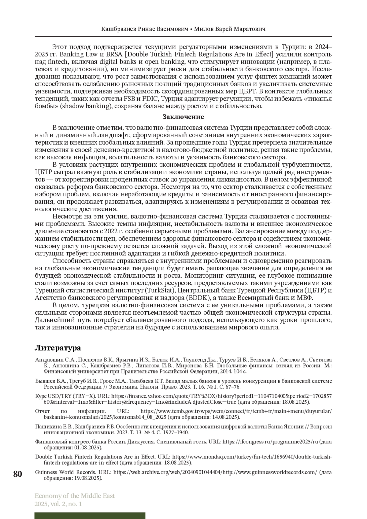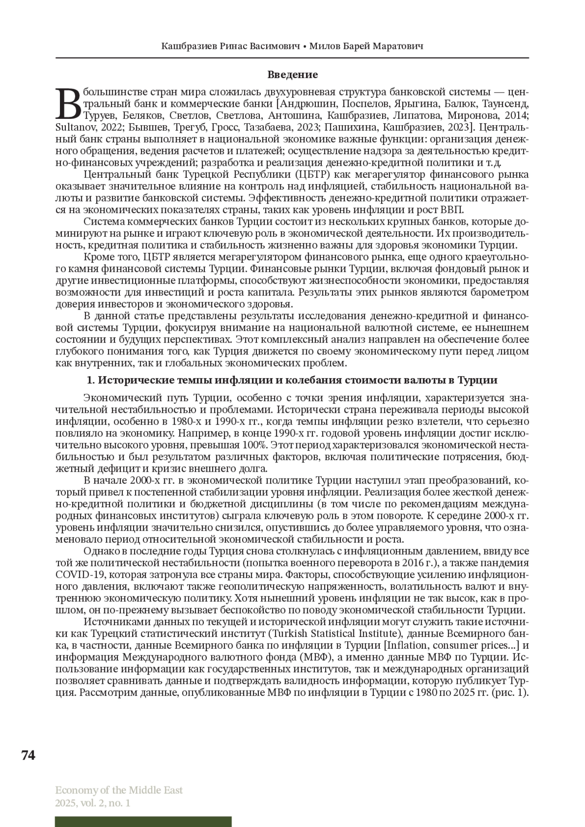 Валютно-финансовая система Турции играет решающую роль в формировании ее экономического ландшафта. В данной статье рассматриваются основные направления деятельности Центрального банка Турецкой Республики и его роль в стабилизации экономики страны. В статье анализируется динамика инфляции и курса турецкой лиры с 1980-х гг. до 2025 г. Рассматриваются периоды гиперинфляции (до 110% в 1990-х), экономические реформы начала XXI в., деноминация 2005 г. и период низкой инфляции, а также современные вызовы (инфляция 53,9% в 2023 г.). Особое внимание уделено таким аспектам деятельности Центрального банка Турции как переход к таргетированию инфляции, повышению ключевой ставки (до 42,5% в 2024 г.) и стратегии «мягкой посадки». Показано, что с июня 2024 г. наблюдается процесс дефляции, который с тех пор продолжается непрерывно: инфляция в июле 2025 г. снизилась до 33,5%, а к концу 2025 г. будет находиться в диапазоне 25%–29%, 2026 г. — в пределах 13%–19%. Сделан вывод о том, что значительный прогресс в снижении инфляции связан с возвращением к традиционной денежно-кредитной политике. Вместе с тем, несмотря на снижение инфляции, ключевыми рисками остаются волатильность лиры и внешние шоки. Использованы данные МВФ, Центрального банка Турции и Всемирного банка.