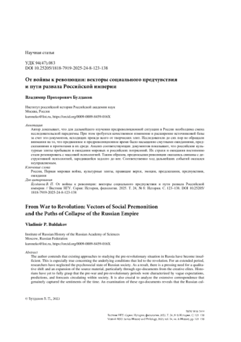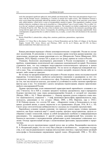 Автор доказывает, что для дальнейшего изучения предреволюционной ситуации в России необходима смена исследовательской парадигмы. При этом требуется качественное изменение и расширение источниковой базы за счет эго-документов, исходящих прежде всего от творческих элит. Исследователи до сих пор не обращали внимания на то, что предвоенное и предреволюционное время было насыщенно смутными ожиданиями, предсказаниями и прогнозами в их среде. Анализ соответствующих документов показывает, что российские культурные элиты пребывали в ожидании мировых и российских потрясений. Их страхи и ожидания постепенно стали резонировать с массовой психологией. Таким образом, предпосылки революции оказались связаны с деструктивной психологией, зародившейся задолго до нее. Соответственно ход дальнейших событий оказался неуправляемым.