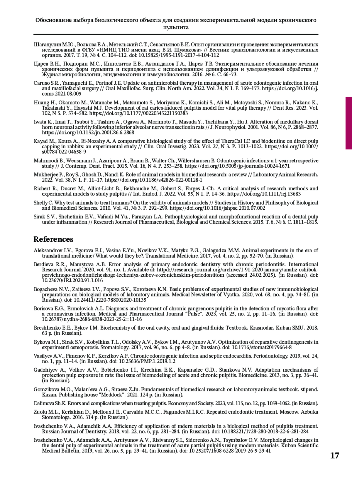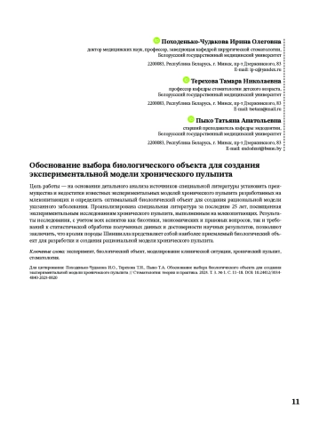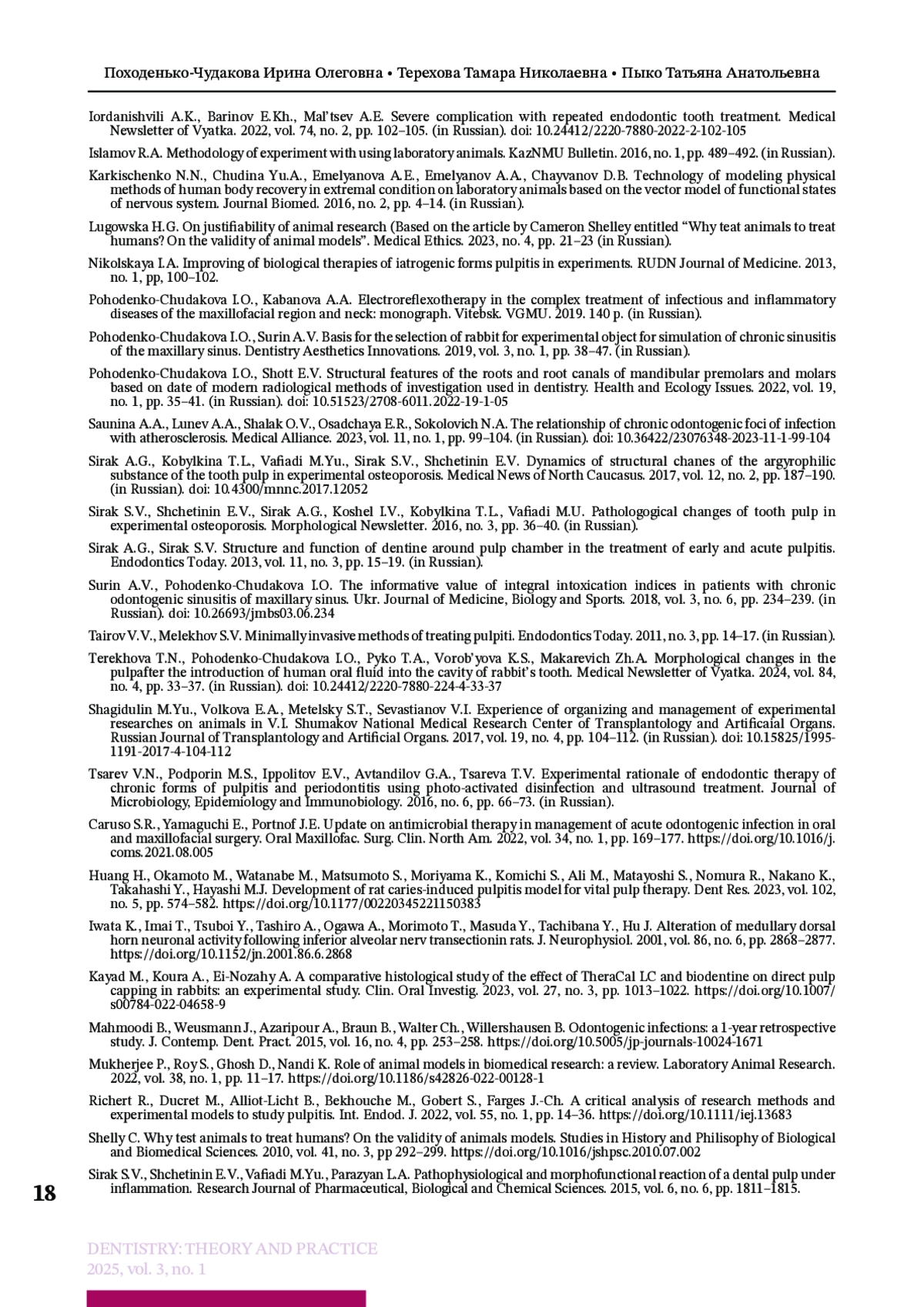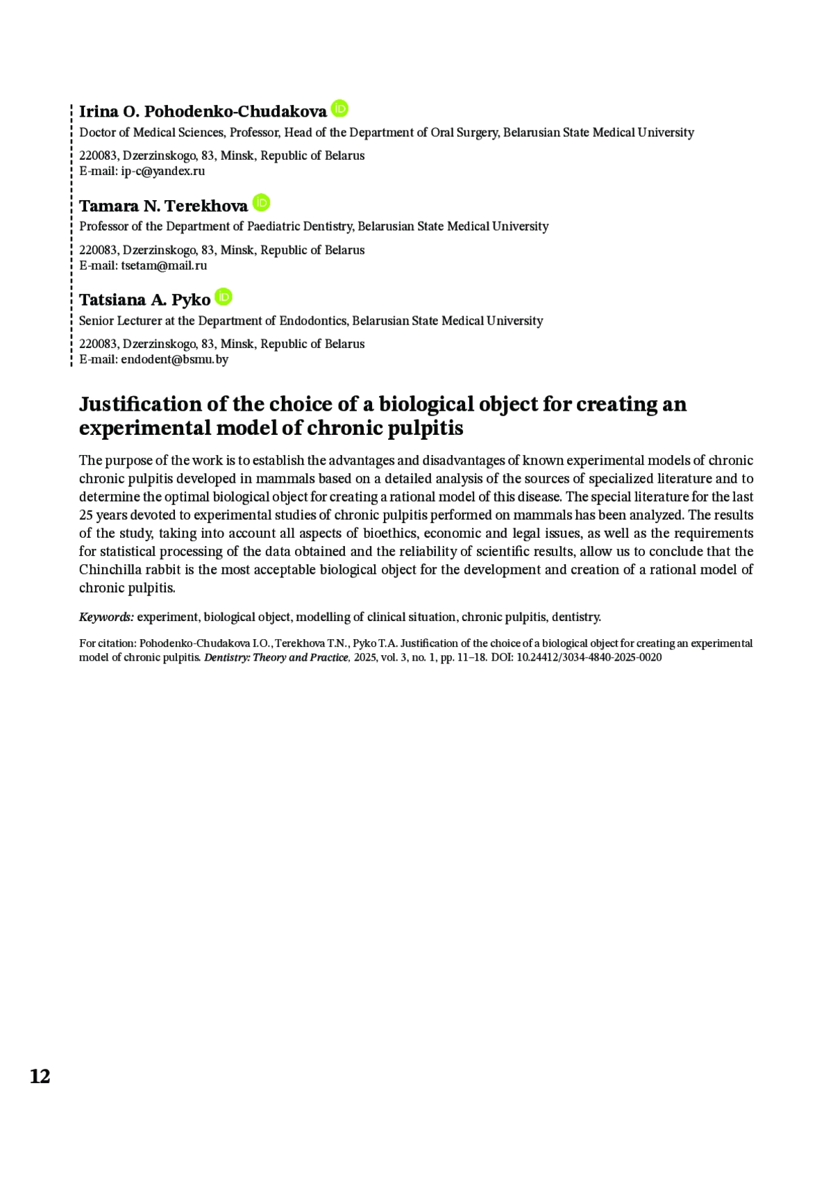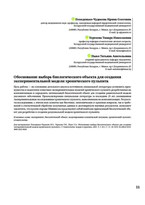 ПОХОДЕНЬКО-ЧУДАКОВА И. О., ТЕРЕХОВА Т. Н., ПЫКО Т. А. ОБОСНОВАНИЕ ВЫБОРА БИОЛОГИЧЕСКОГО ОБЪЕКТА ДЛЯ СОЗДАНИЯ ЭКСПЕРИМЕНТАЛЬНОЙ МОДЕЛИ ХРОНИЧЕСКОГО ПУЛЬПИТА // СТОМАТОЛОГИЯ: ТЕОРИЯ И ПРАКТИКА. 2025. № 1, ТОМ 3
