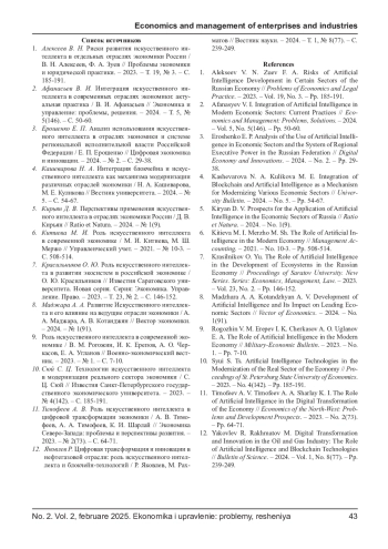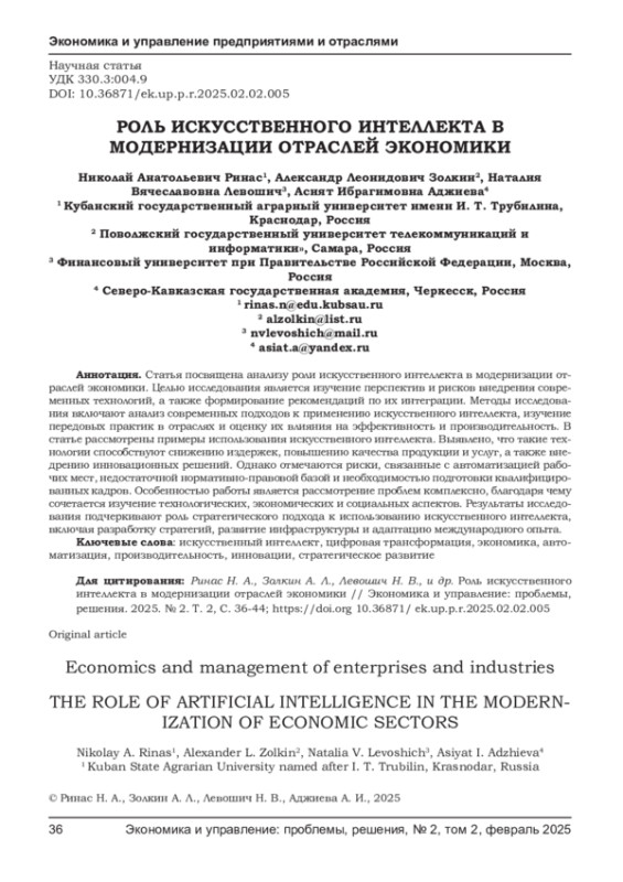 РИНАС Н. А., ЗОЛКИН А. Л., ЛЕВОШИЧ Н. В., АДЖИЕВА А. И. РОЛЬ ИСКУССТВЕННОГО ИНТЕЛЛЕКТА В МОДЕРНИЗАЦИИ ОТРАСЛЕЙ ЭКОНОМИКИ // ЭКОНОМИКА И УПРАВЛЕНИЕ: ПРОБЛЕМЫ, РЕШЕНИЯ. 2025. ТОМ 2 № 2
