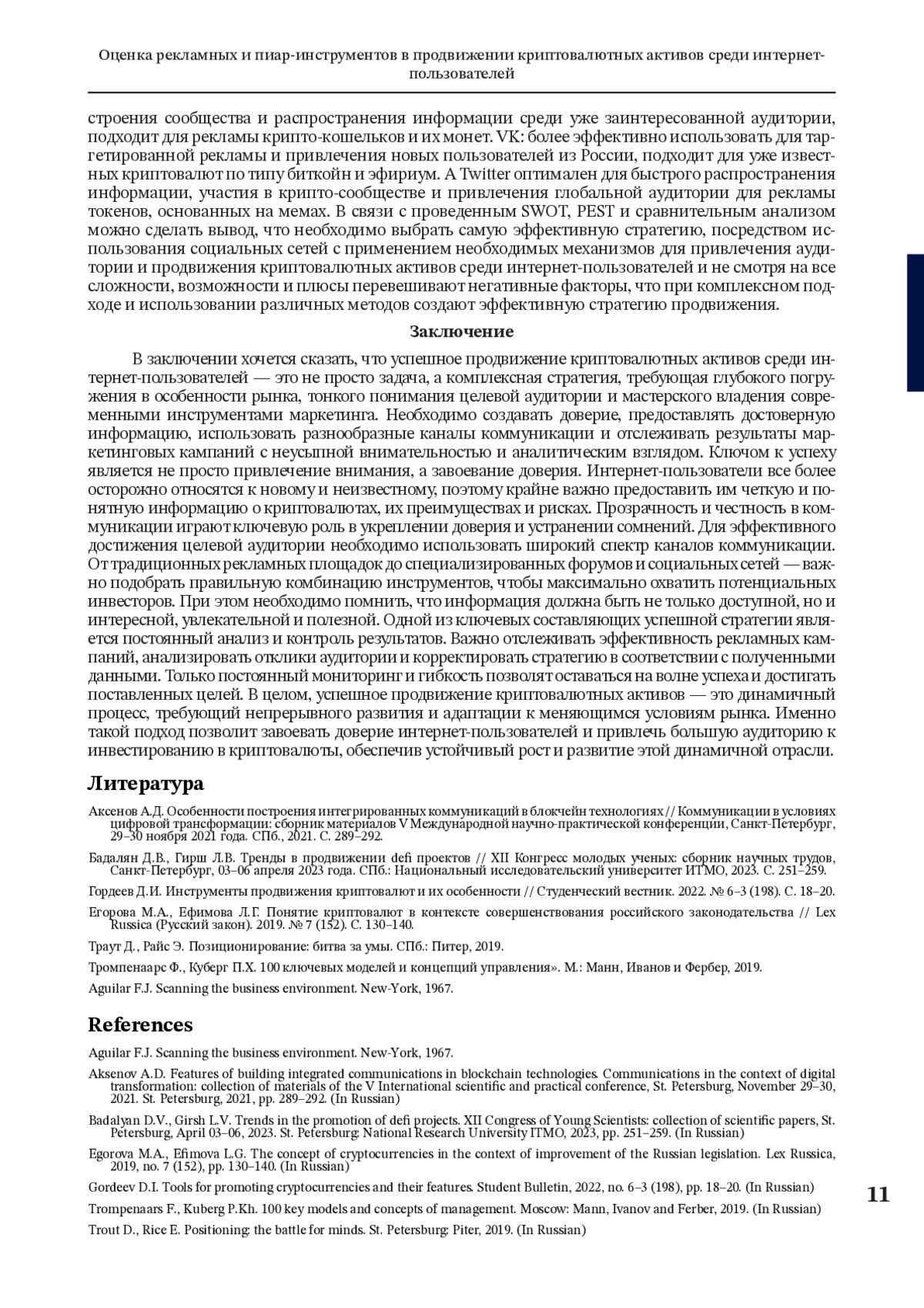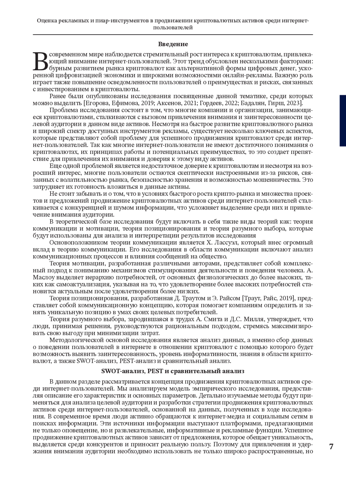 Статья посвящена оценке рекламных и пиар-инструментов в продвижении криптовалютных активов среди интернет-пользователей продвижения криптовалютных активов среди интернет-пользователей. В условиях стремительного роста крипторынка и растущего интереса к цифровым активам, ключевую роль играет правильный выбор маркетинговых инструментов и методов. В теоретической части рассматриваются: теория коммуникации по Х. Лассуэлу, мотивации по А. Маслоу, теория позиционирования по Д. Трауту и Э. Райсу и теория разумного выбора А. Смита и Джона Стюарта Милля. В ходе исследования было выявлено, что необходимо использовать широкий спектр форм анализа продвижения в интернете из-за быстрого и непрерывного развития технологий. Также в исследовании было проанализировано криптовалютных активов среди интернет-пользователей, проведены SWOT, сравнительный анализ, PEST-анализ показал, что макросреда создает благоприятные условия для продвижения криптовалютных активов, и в настоящее время возможности превышают угрозы. В результате данных, полученных после анализа, были разработаны цель, задачи для дальнейшего исследования. В процессе работы все аспекты были выполнены, а также подтверждены. В заключении говорится о том, что для успешного продвижения криптовалютных активов среди интернет-пользователей нужно понимать рынок, цифровые активы, инструменты рынка.