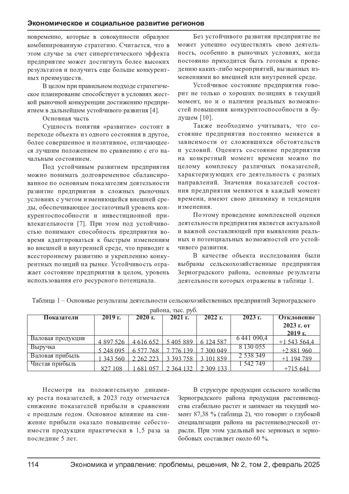 В настоящей статье автором рассматривается актуальная проблема устойчивого развития предприятий сельскохозяйственной отрасли в условиях изменчивой внешней среды. Раскрыта сущность понятий «стратегическое планирование», «развитие», «устойчивость» и «устойчивое развитие». Описаны особенности и задачи стратегического планирования деятельности сельскохозяйственных предприятий с учетом специфики сельскохозяйственного производства. Показана значимость анализа и оценки современного состояния сельскохозяйственного предприятия в целях выявления реальных и потенциальных возможностей его устойчивого развития. Представлены результаты оценки деятельности сельскохозяйственных предприятий Зерноградского района на основе анализа показателей рентабельности, финансовой устойчивости, обеспеченности материальными ресурсами. Проведена оценка сильных и слабых сторон деятельности предприятий. Выявлены проблемы и угрозы со стороны внешней среды, оказывающие негативное влияние на перспективы успешного развития предприятий в будущем и требующие принятия соответствующих управленческих решений. Сделан вывод, что сельскохозяйственные предприятия Зерноградского района имеют хорошие возможности дальнейшего устойчивого развития при грамотном выборе эффективных стратегических направлений деятельности.