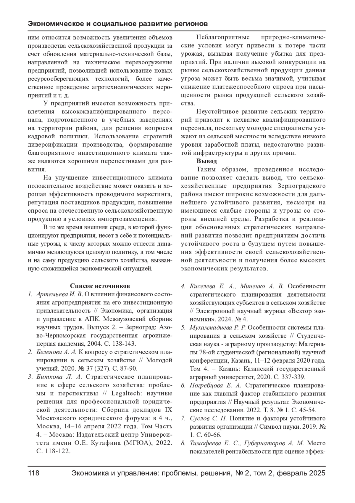 4. Киселева Е. А., Миненко А. В. Особенности стратегического планирования деятельности хозяйствующих субъектов в сельском хозяйстве // Электронный научный журнал “Вектор экономики”. 2024. № 4. EDN: QFLSQT
