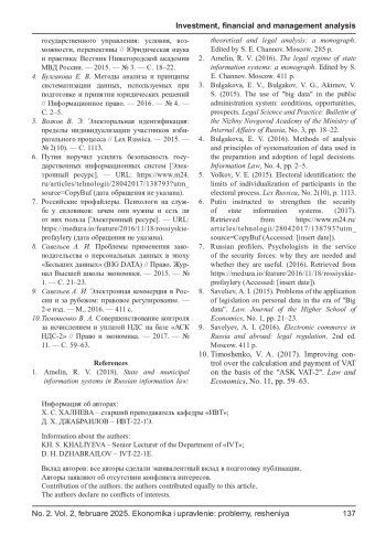 3. Булгакова Е. В., Булгаков В. Г., Акимов В. С. Использование “больших данных” в системе государственного управления: условия, возможности, перспективы // Юридическая наука и практика: Вестник Нижегородской академии МВД России. - 2015. - № 3. - С. 18-22.