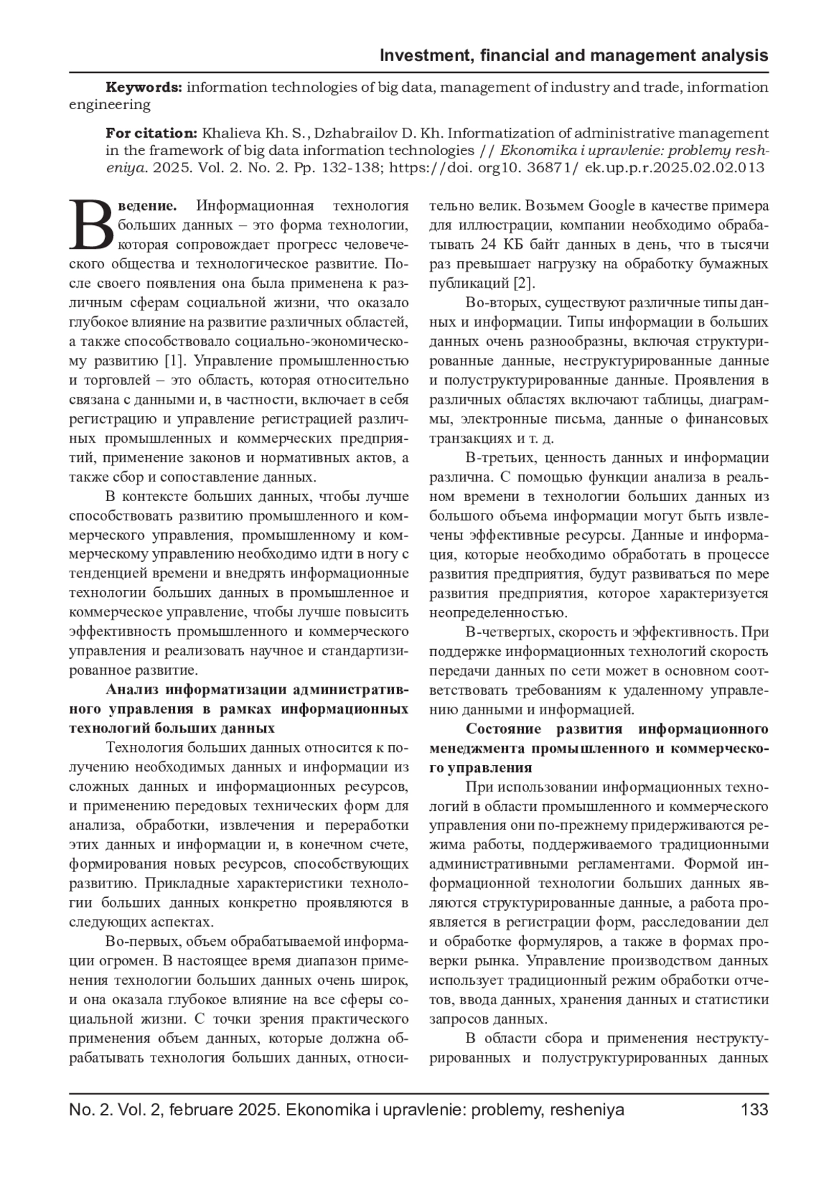 Быстрое развитие информационных сетей и компьютерных технологий привело человеческое общество к вступлению в эру больших данных. Технология больших данных начала применяться в различных сферах общественной жизни. Извлечение ценной информации из огромных объемов информации может способствовать усовершенствованному развитию различных областей. Исходя из этого, на основе разъяснения смысла и характеристик технологии обработки больших данных, а также исходя из текущей ситуации в управлении промышленной и коммерческой административной информацией, в данной статье анализируется, как повысить уровень информатизации промышленного и коммерческого администрирования в контексте информационных технологий больших данных, направленных на содействие устойчивому развитию отдела промышленного и коммерческого управления.