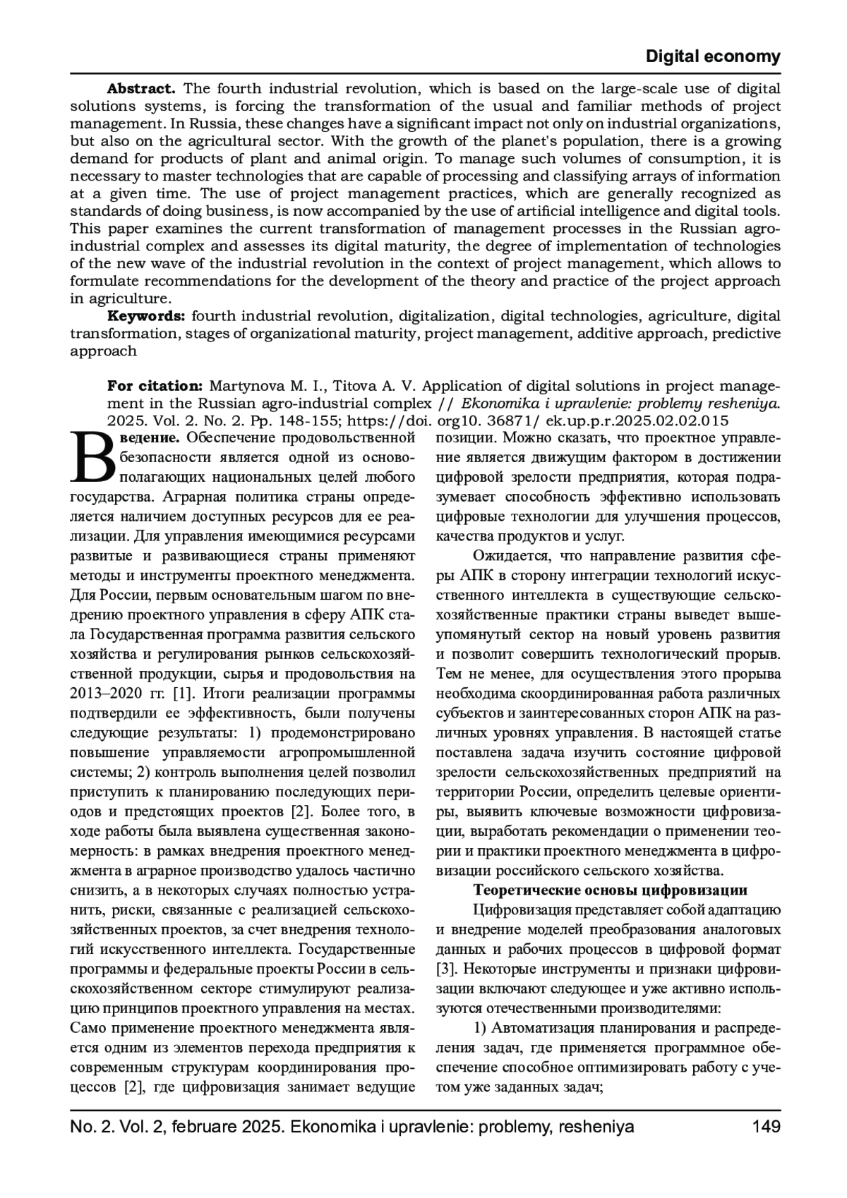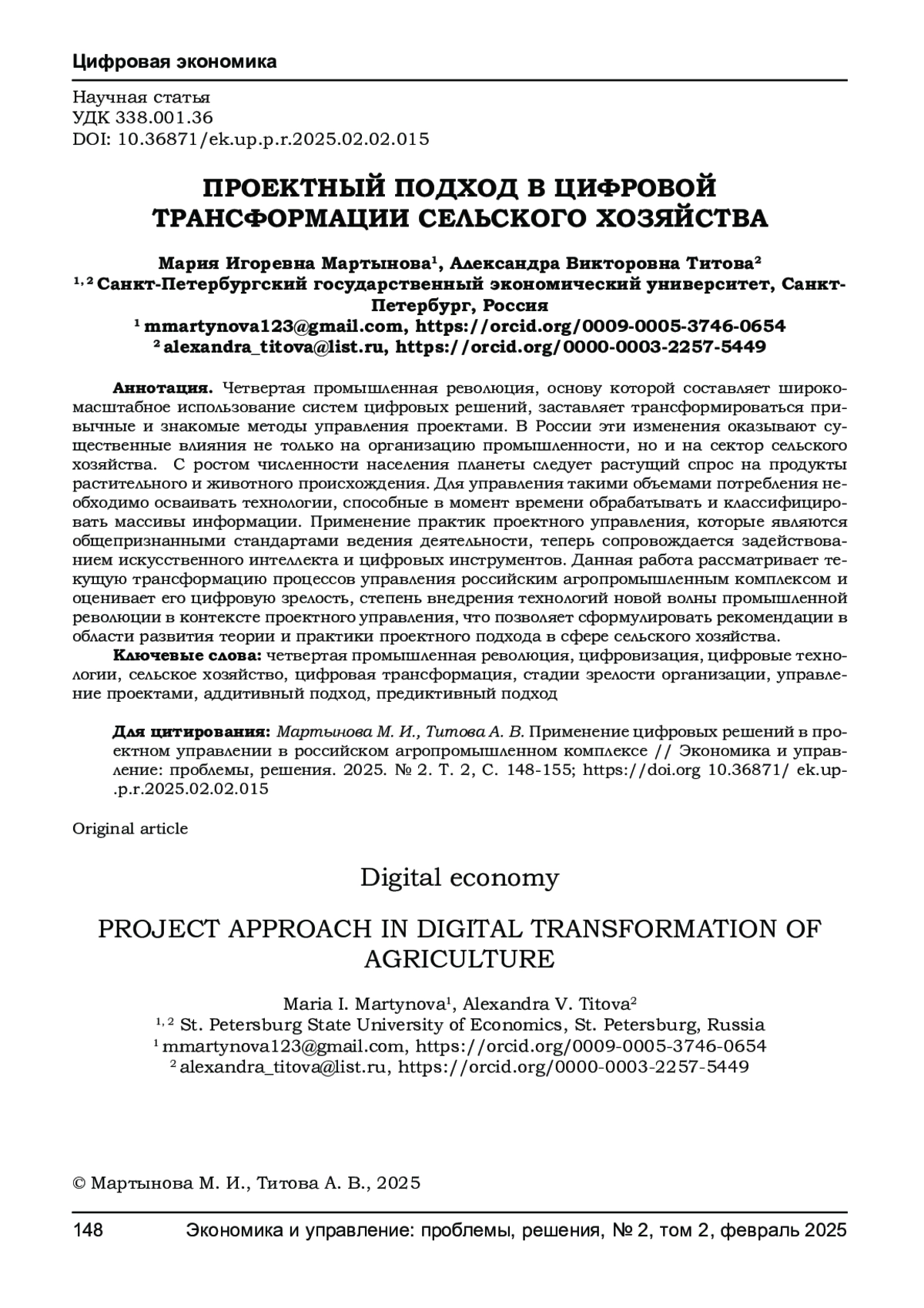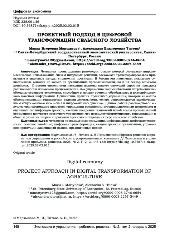 Четвертая промышленная революция, основу которой составляет широкомасштабное использование систем цифровых решений, заставляет трансформироваться привычные и знакомые методы управления проектами. В России эти изменения оказывают существенные влияния не только на организацию промышленности, но и на сектор сельского хозяйства. С ростом численности населения планеты следует растущий спрос на продукты растительного и животного происхождения. Для управления такими объемами потребления необходимо осваивать технологии, способные в момент времени обрабатывать и классифицировать массивы информации. Применение практик проектного управления, которые являются общепризнанными стандартами ведения деятельности, теперь сопровождается задействованием искусственного интеллекта и цифровых инструментов. Данная работа рассматривает текущую трансформацию процессов управления российским агропромышленным комплексом и оценивает его цифровую зрелость, степень внедрения технологий новой волны промышленной революции в контексте проектного управления, что позволяет сформулировать рекомендации в области развития теории и практики проектного подхода в сфере сельского хозяйства.