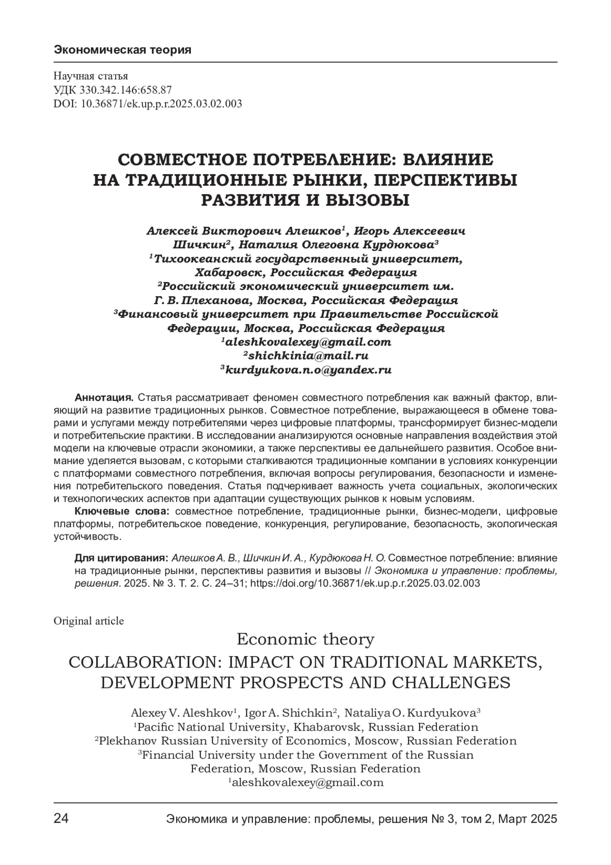 Статья рассматривает феномен совместного потребления как важный фактор, влияющий на развитие традиционных рынков. Совместное потребление, выражающееся в обмене товарами и услугами между потребителями через цифровые платформы, трансформирует бизнес- модели и потребительские практики. В исследовании анализируются основные направления воздействия этой модели на ключевые отрасли экономики, а также перспективы ее дальнейшего развития. Особое внимание уделяется вызовам, с которыми сталкиваются традиционные компании в условиях конкуренции с платформами совместного потребления, включая вопросы регулирования, безопасности и изменения потребительского поведения. Статья подчеркивает важность учета социальных, экологических и технологических аспектов при адаптации существующих рынков к новым условиям.