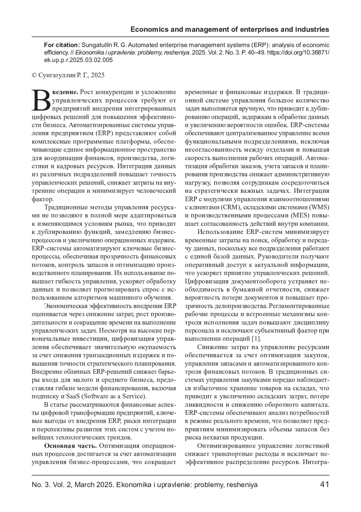 Развитие цифровых технологий повышает потребность предприятий в интеграции автоматизированных систем управления (ERP), направленных на оптимизацию бизнес- процессов и снижение операционных затрат. Внедрение ERP-систем обеспечивает централизованный контроль ресурсов, автоматизацию учета, управление финансовыми потоками и прогнозирование спроса. Экономическая эффективность этих решений выражается в повышении производительности, снижении транзакционных издержек и улучшении управления цепочками поставок. В статье анализируются инвестиционные затраты на внедрение ERP, источники финансирования, ключевые выгоды для бизнеса и возможные риски. Рассматриваются перспективы развития ERP-систем с учетом технологических трендов, включая облачные вычисления, искусственный интеллект и интеграцию с интернетом вещей.