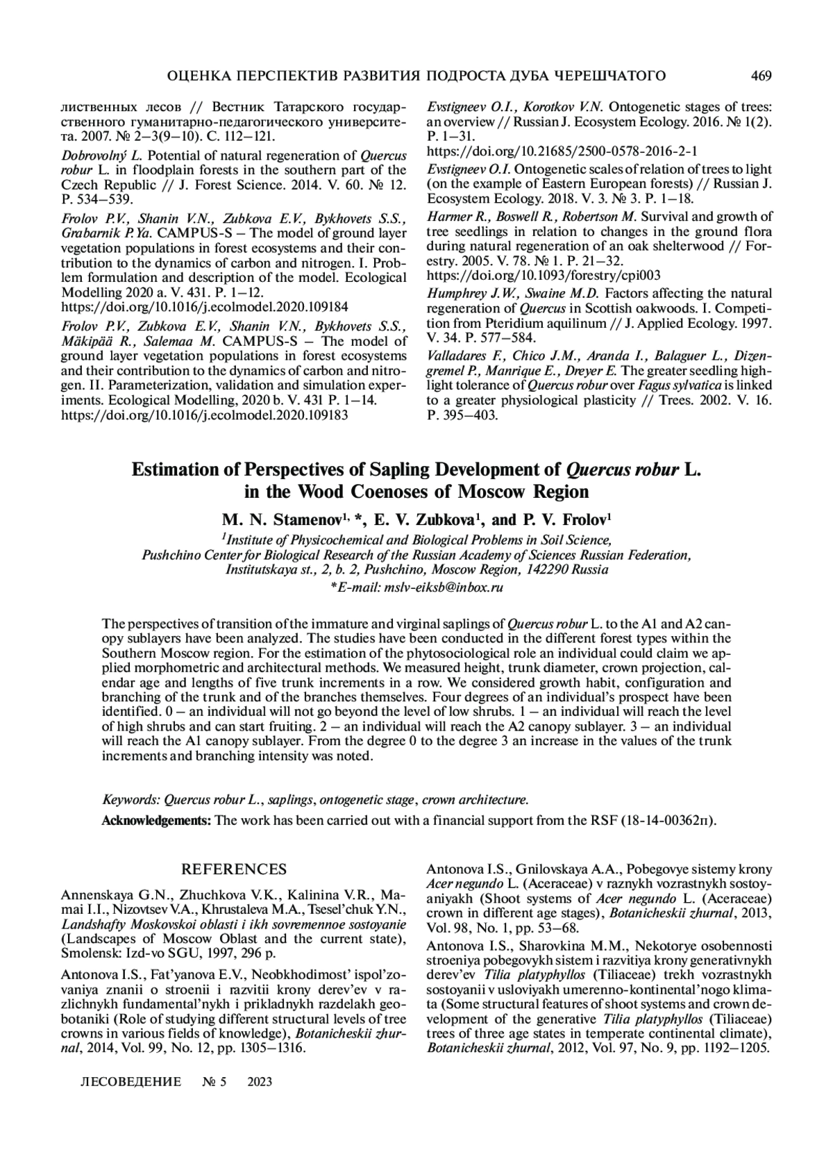 22. Frolov P.V., Shanin V.N., Zubkova E.V., Bykhovets S.S., Grabarnik P.Ya. CAMPUS-S – The model of ground layer vegetation populations in forest ecosystems and their contribution to the dynamics of carbon and nitrogen. I. Problem formulation and description of the model. Ecological Modelling 2020 a. V. 431. P. 1–12. DOI: 10.1016/j.ecolmodel.2020.109184 EDN: LXEZOT