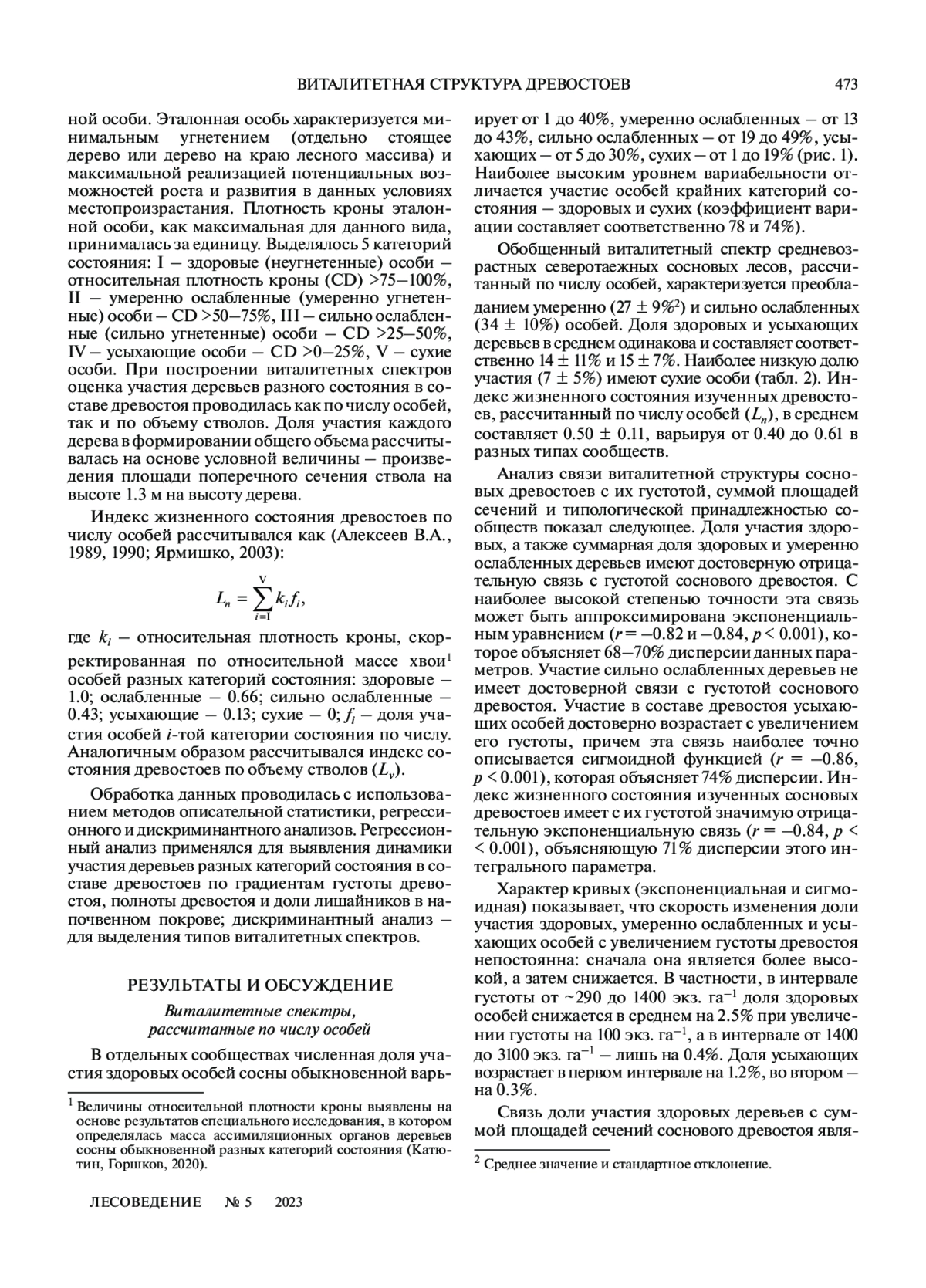 Анализ жизненного состояния деревьев и виталитетной структуры древостоев лесообразующих видов является одной из актуальных научных задач не только для мониторинга и оценки различных видов антропогенного воздействия на лесные сообщества (Tveite, 1987; Алексеев В. А., 1990; Ярмишко, 1990, 1997; Черненькова, 2002; Ярмишко и др., 2003; Dobbertin, 2005; Торлопова, Ильчуков, 2007; Kozlov et al., 2009; Augustaitis et al., 2010; Ставрова и др., 2010; Eichhorn, Roskams, 2013; Ярмишко, Игнатьева, 2019; Choi et al., 2021), но и для выявления закономерностей организации и динамики естественных лесных экосистем, развивающихся в отсутствие антропогенных нарушений (Бебия, 2000; Rötzer et al., 2005; Демидко, 2006; Кривец и др., 2008; Шорохова, 2013; Stavrova et al., 2020)