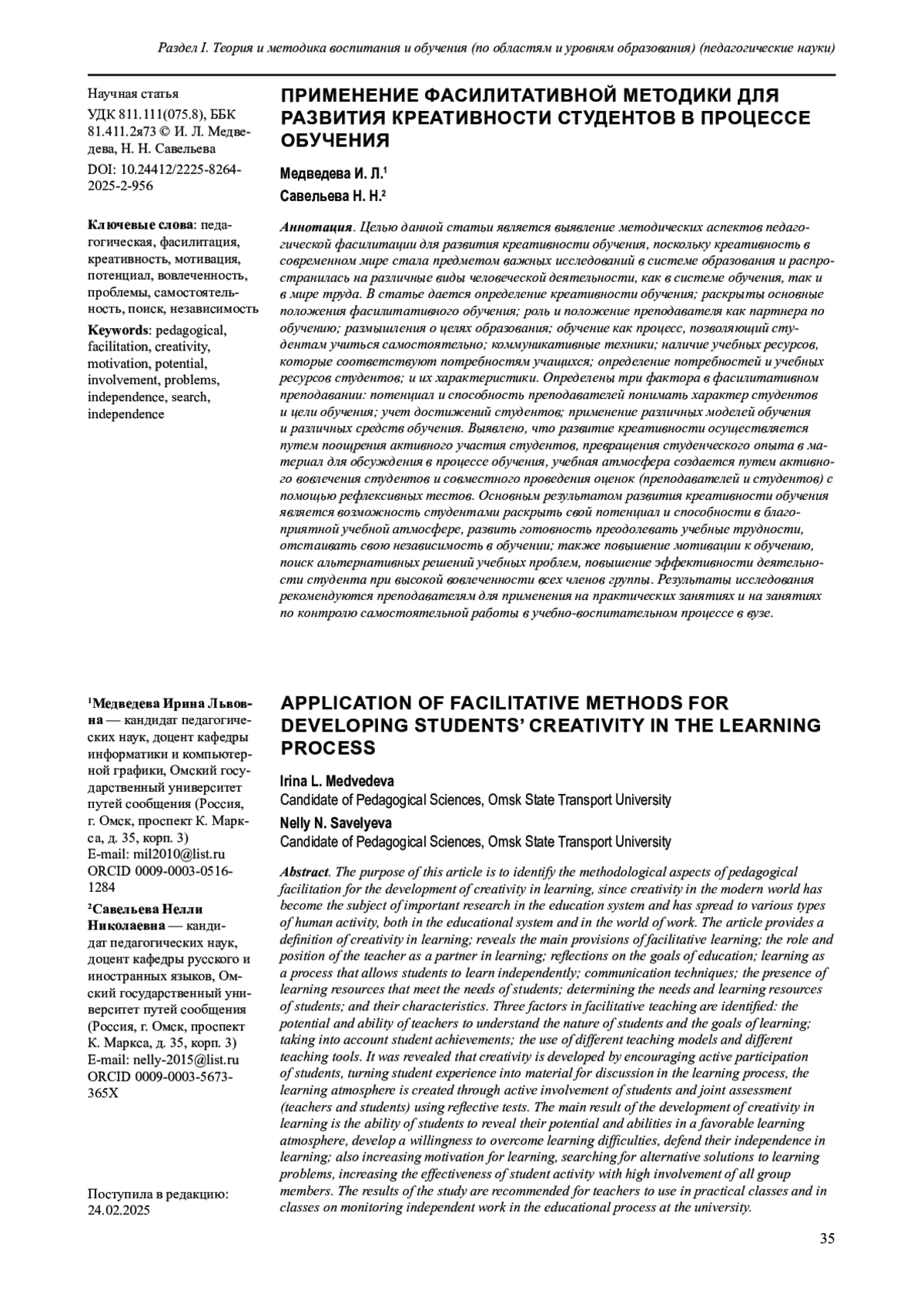 2. Медведева И. Л., Савельева Н. Н. Кураторство как условие успешной адаптации студентов и реализации фасилитативного обучения в вузе // Вестник Сибирского института бизнеса и информационных технологий. 2024. Т. 13. № 2. С. 43-47.