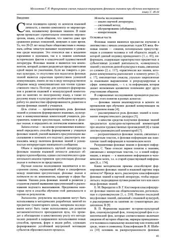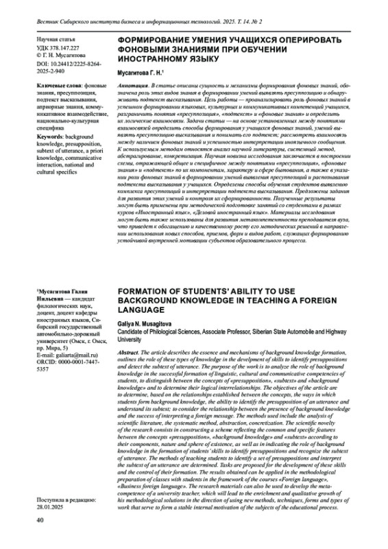 В статье описаны сущность и механизмы формирования фоновых знаний, обозначена роль этих видов знания в формировании умений выявлять пресуппозицию и обнаруживать подтекст высказывания. Цель работы — проанализировать роль фоновых знаний в успешном формировании языковых, культурных и коммуникативных компетенций учащихся, разграничить понятия «пресуппозиция», «подтекст» и «фоновые знания» и определить их логические взаимосвязи. Задачи статьи — на основе установленных между понятиями взаимосвязей определить способы формирования у учащихся фоновых знаний, умений выявлять пресуппозицию высказывания и понимать его подтекст; рассмотреть взаимосвязь между наличием фоновых знаний и успешностью интерпретации иноязычного сообщения. К используемым методам относятся анализ научной литературы, системный метод, абстрагирование, конкретизация. Научная новизна исследования заключается в построении схемы, отражающей общее и специфичное между понятиями «пресуппозиция», «фоновые знания» и «подтекст» по их компонентам, характеру и сфере бытования, а также в указании роли фоновых знаний в формировании умений выявления пресуппозиций и распознавания подтекста высказывания у учащихся. Определены способы обучения студентов выявлению комплекса пресуппозиций и интерпретации подтекста высказывания. Предложены задания для развития этих умений и контроля их сформированности. Полученные результаты могут быть применены при методической подготовке занятий со студентами в рамках курсов «Иностранный язык», «Деловой иностранный язык». Материалы исследования могут быть также использованы для развития метакомпетентности преподавателя вуза, что приведет к обогащению и качественному росту его методических решений в направлении использования новых способов, приемов, форм и видов работ, служащих формированию устойчивой внутренней мотивации субъектов образовательного процесса.