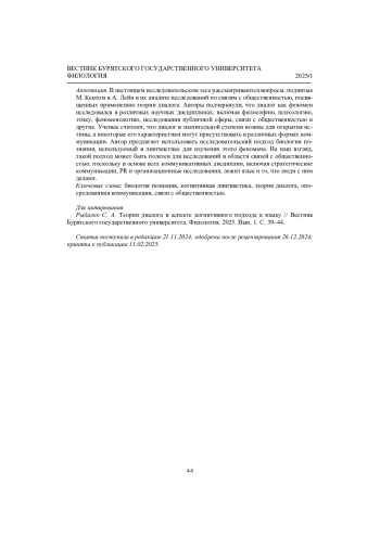 РЫБАЛКО С. А. ТЕОРИИ ДИАЛОГА В АСПЕКТЕ КОГНИТИВНОГО ПОДХОДА К ЯЗЫКУ // ВЕСТНИК БУРЯТСКОГО ГОСУДАРСТВЕННОГО УНИВЕРСИТЕТА. ФИЛОЛОГИЯ. 2025. № 1