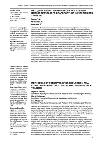 Определяются основания изучения взаимосвязи рефлексивности и психологического благополучия. Выявлены различия в параметрах психологического благополучия начинающих учителей с разным уровнем рефлексивности. Обнаружено преобладание среднего уровня психологического благополучия у начинающих учителей, при среднем и низком уровнях развития личностной рефлексии. Также выделены и описаны группы затруднений (коммуникативные, организационные, конструктивные) с которыми сталкиваются учителя в начале профессиональной деятельности.