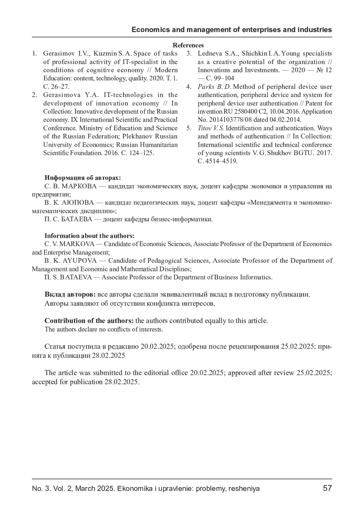 1. Герасимов И.В., Кузьмин С.А. Пространство задач профессиональной деятельности ИТ-специалиста в условиях когнитивной экономики //Современное образование: содержание, технологии, качество. 2020. Т. 1. С. 26-27. EDN: GGOOFS