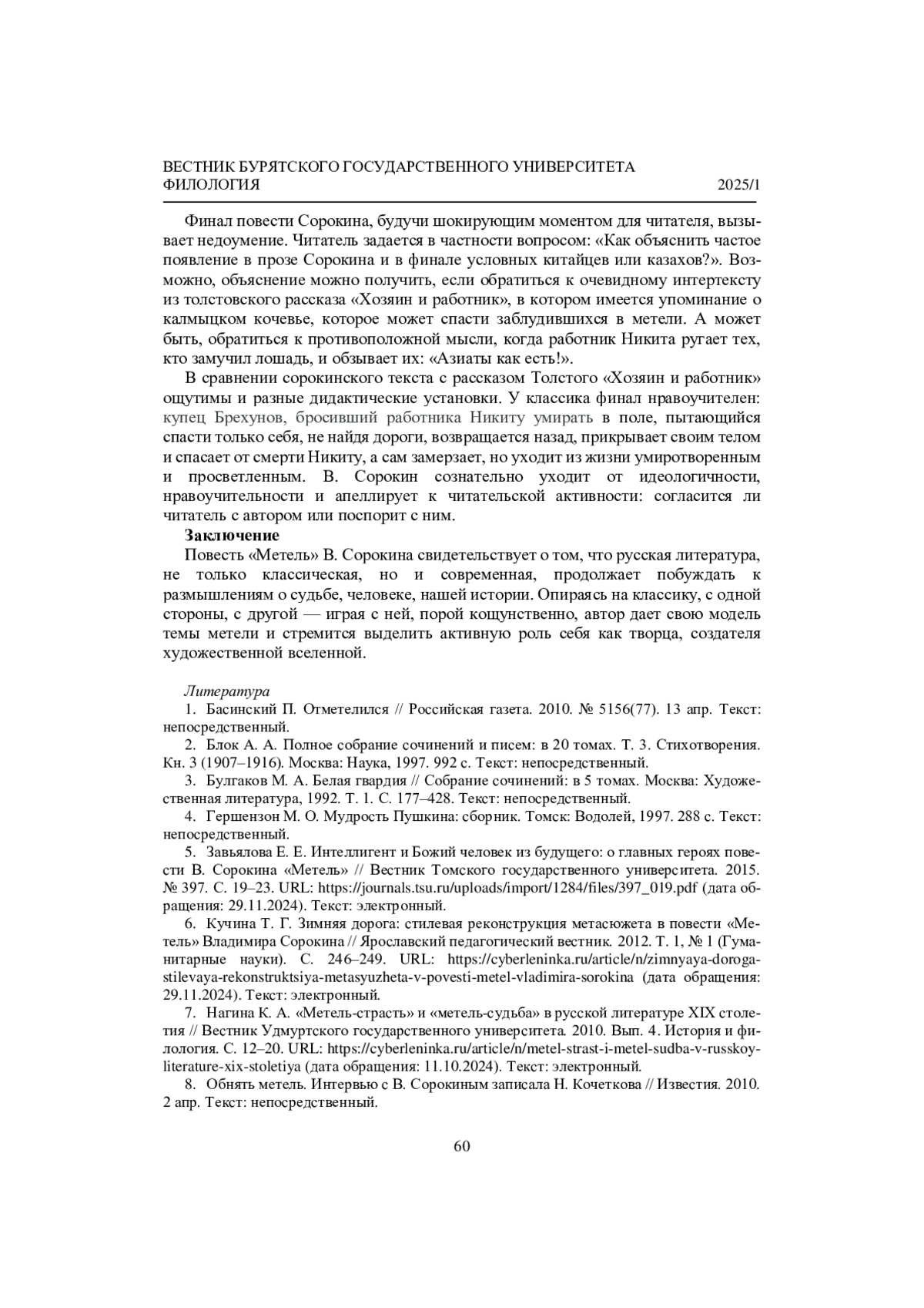 5. Завьялова Е. Е. Интеллигент и Божий человек из будущего: о главных героях повести В. Сорокина “Метель” // Вестник Томского государственного университета. 2015. № 397. С. 19-23. URL: https://joumals.tsu.ru/uploads/import/1284/files/397_019.pdf (дата обращения: 29.11.2024). Текст: электронный. EDN: UIBAEB